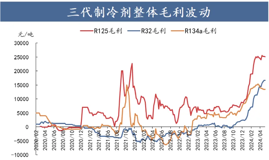 R32是三代制冷剂时代里使用场景最大的产品,参考历史上一次二代制冷剂转向三代制冷剂的过程,就是二代价格靠近三代,那未来可预测的就是三代制冷剂价格一步步靠近四代制冷剂。