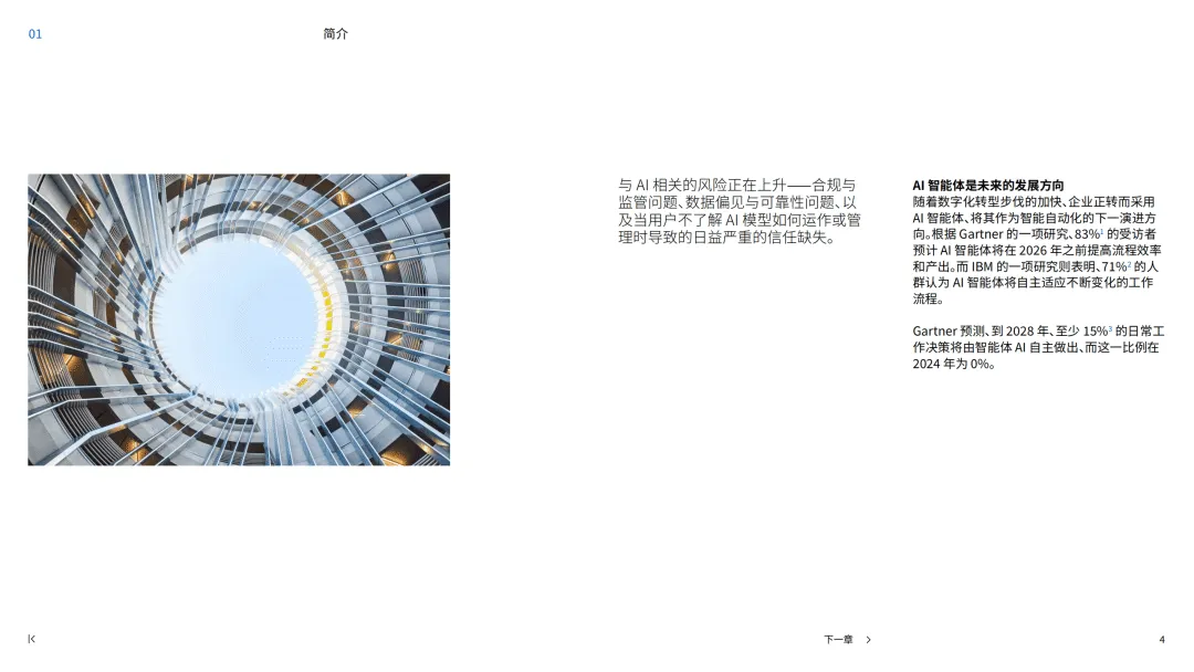 随着生成式AI与AI智能体成为企业创新的核心驱动力,AI在商业领域的应用正加速拓展。Gartner研究显示,83%的受访者预计AI智能体将在2026年前提升流程效率,到2028年15%的日常工作决策将由智能体AI自主完成。然而,AI的规模化发展面临诸多挑战,信任缺失成为主要阻碍,网络安全、隐私保护和结果准确性构成了生成式AI实施的核心障碍。