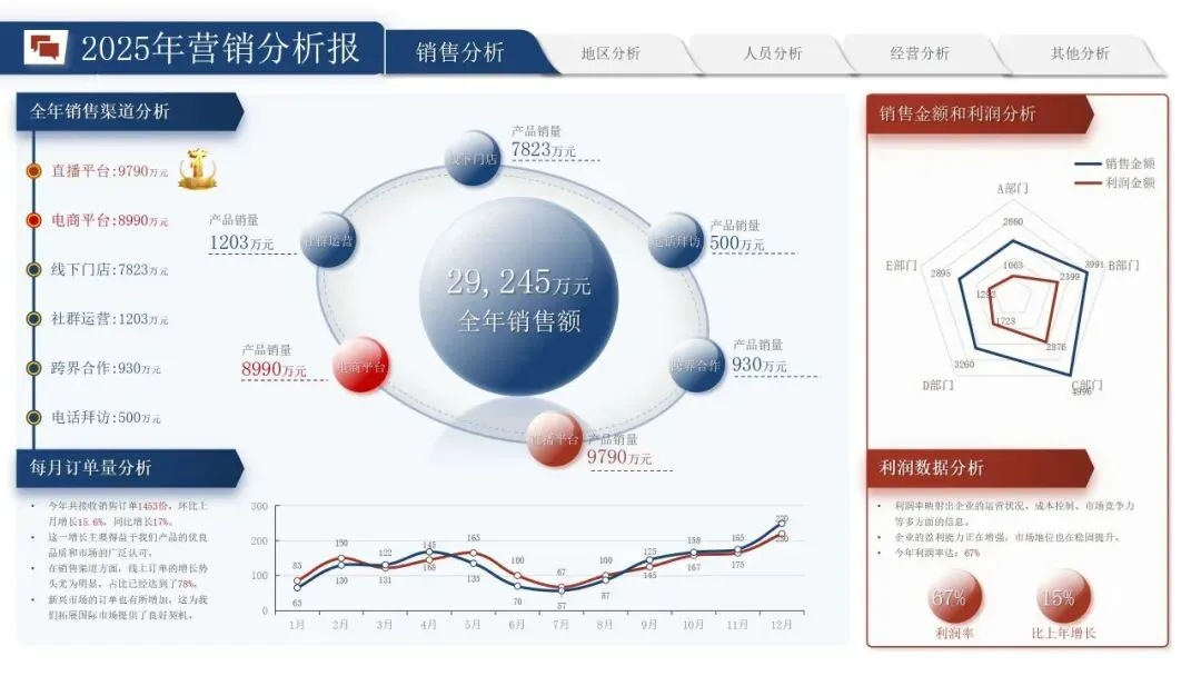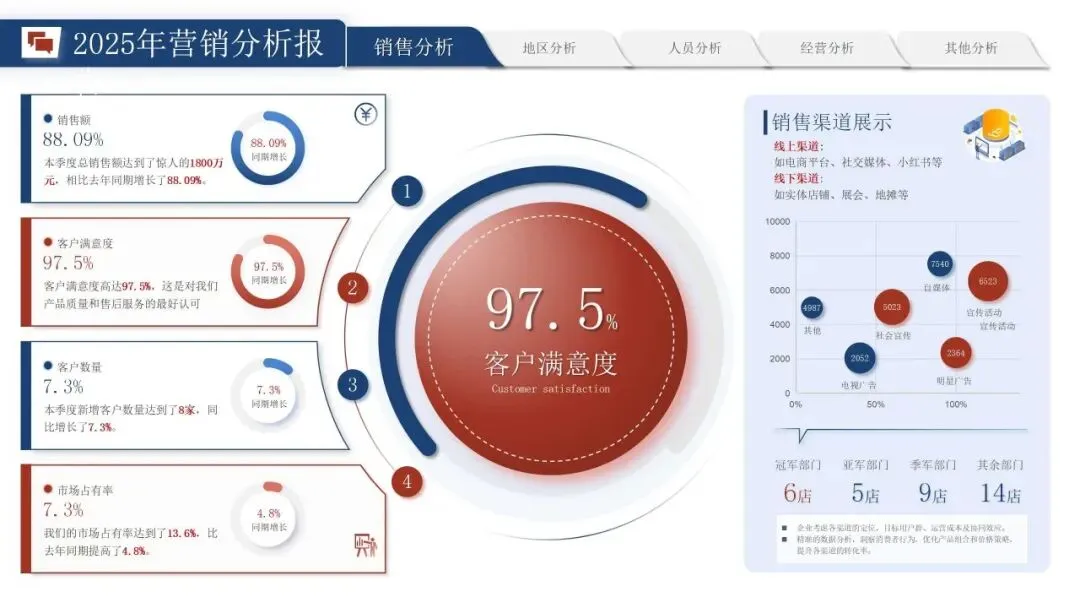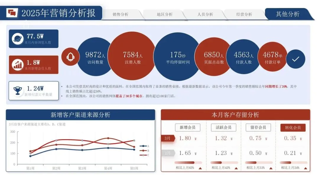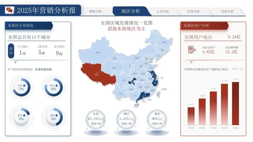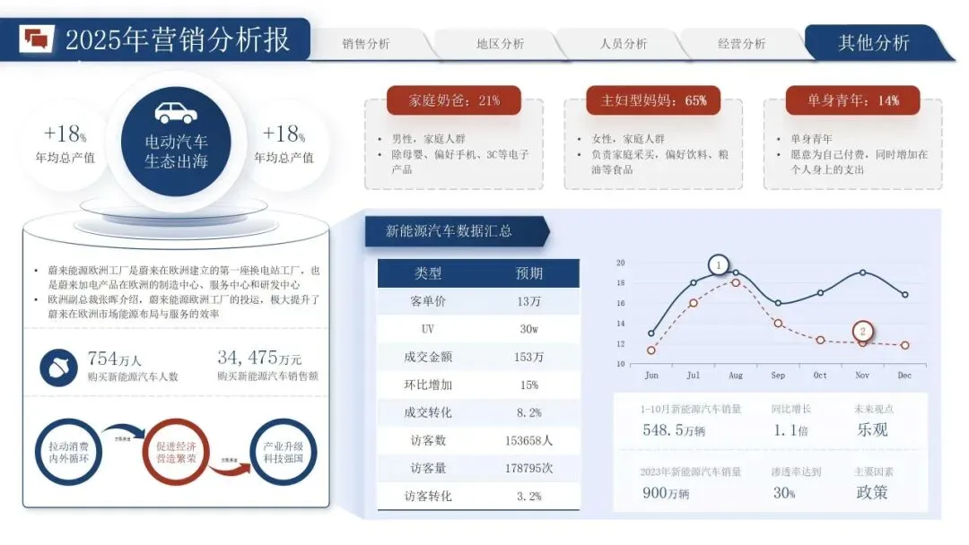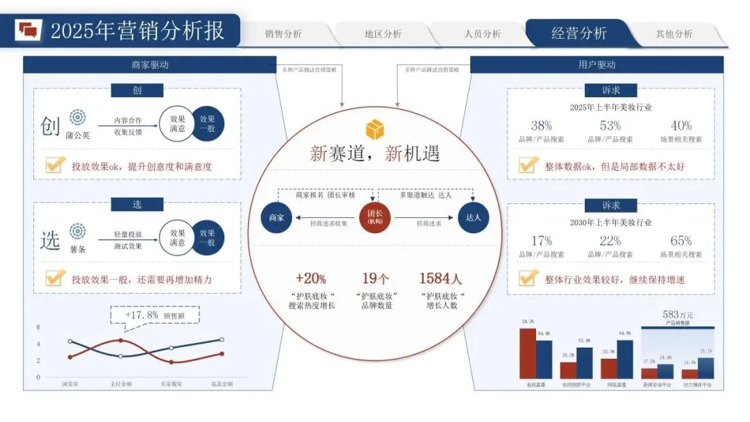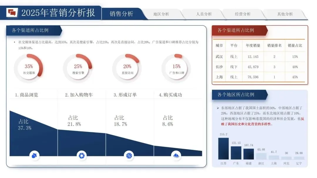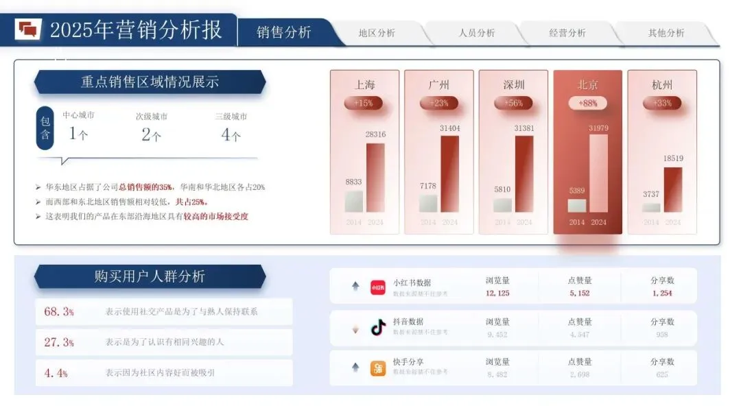 营销分析报告以多维度数据为核心,全面呈现业绩表现 ,销售额同比增长 21%,用户量达 1.6 亿且净增 0.3 亿,核心客群集中在 31-35 岁已婚有孩群体,华东、华南等东部沿海地区贡献主要销售额,线下渠道仍是业务基石且恢复疫情前水平,线上渠道(电商、社交媒体)虽有增长但仍有较大拓展空间,抖音、小红书等平台的浏览量、点赞量等数据为渠道优化提供支撑。