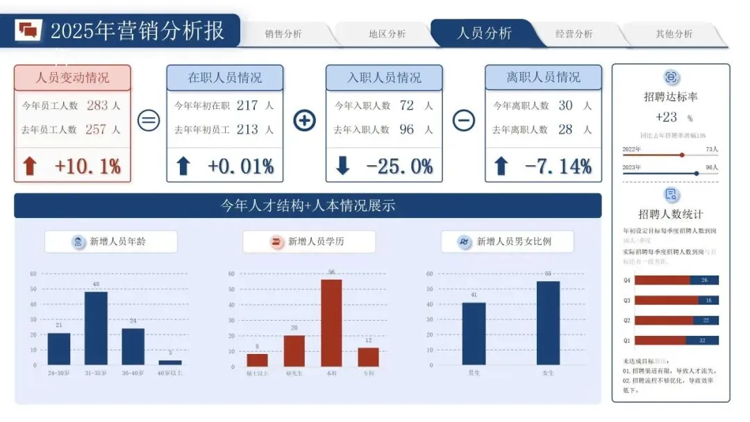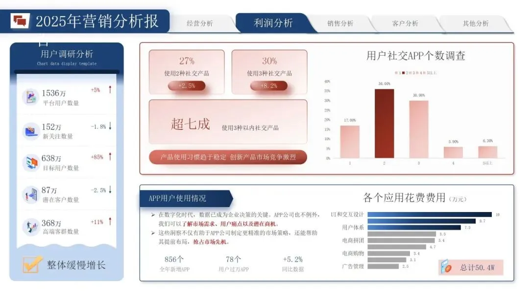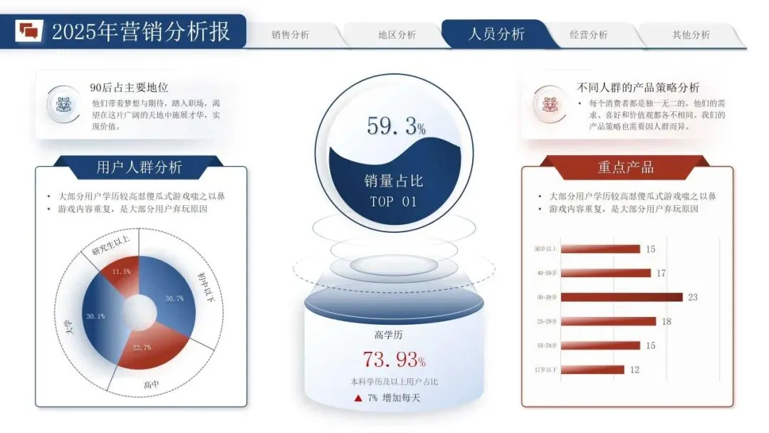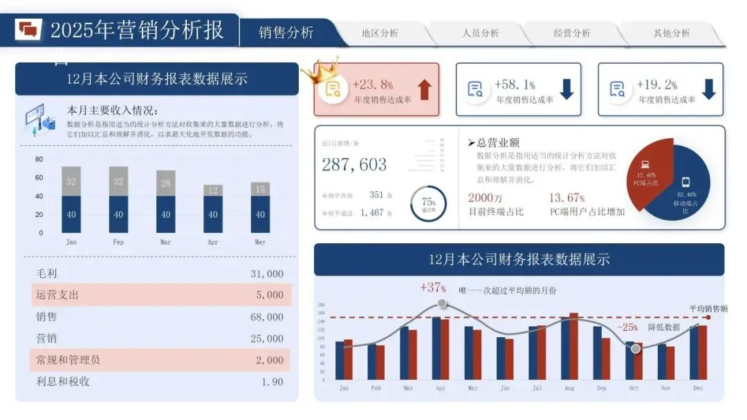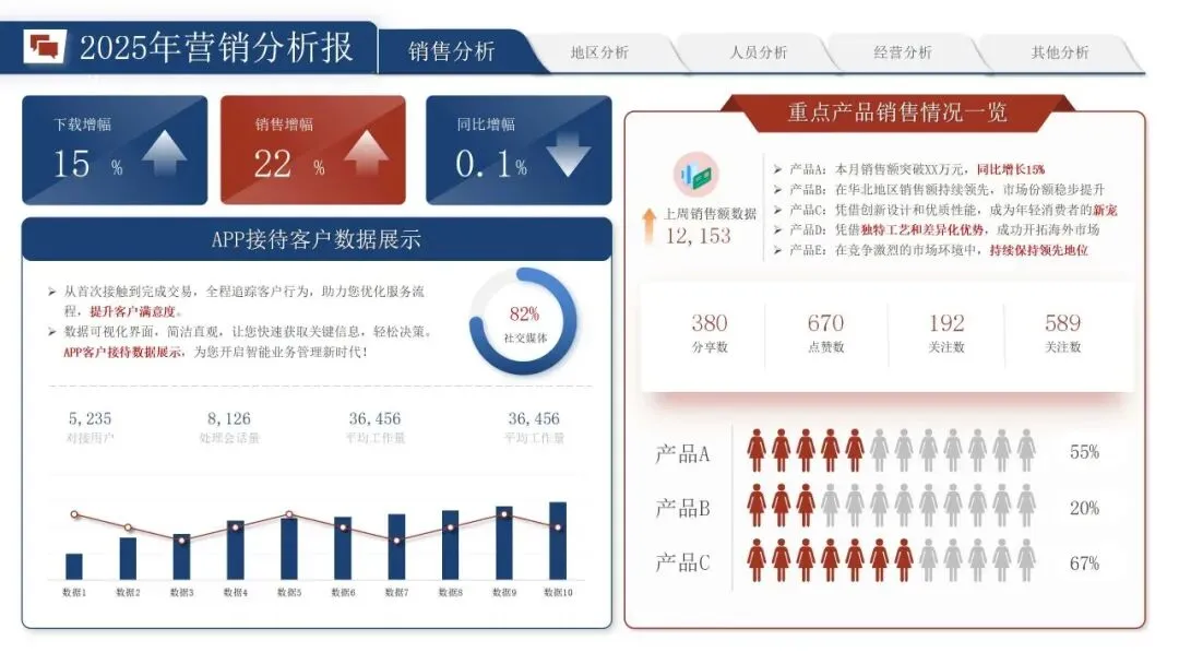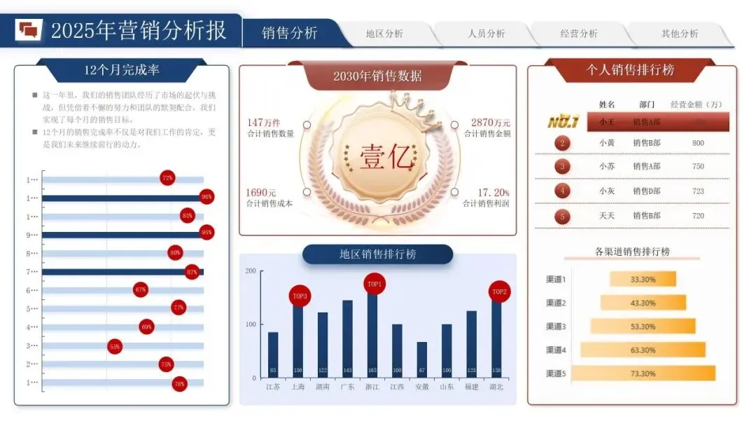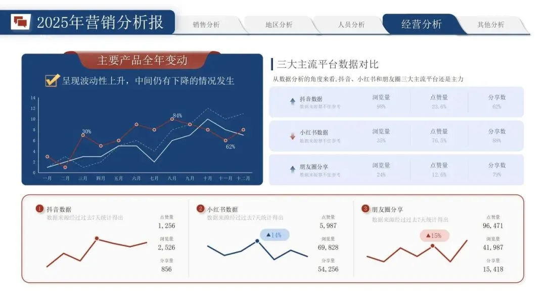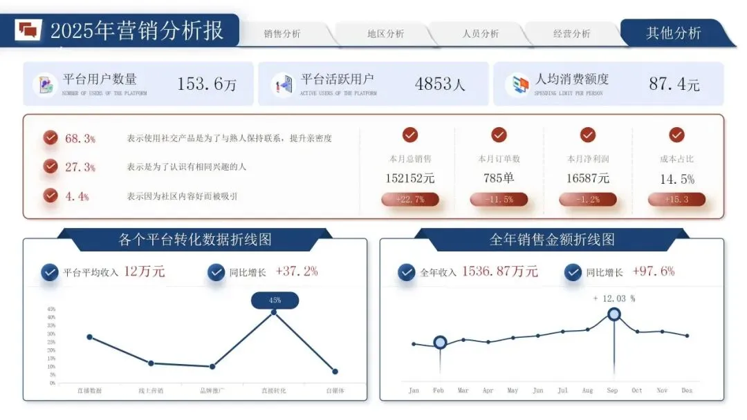营销分析报告以多维度数据为核心,全面呈现业绩表现 ,销售额同比增长 21%,用户量达 1.6 亿且净增 0.3 亿,核心客群集中在 31-35 岁已婚有孩群体,华东、华南等东部沿海地区贡献主要销售额,线下渠道仍是业务基石且恢复疫情前水平,线上渠道(电商、社交媒体)虽有增长但仍有较大拓展空间,抖音、小红书等平台的浏览量、点赞量等数据为渠道优化提供支撑。