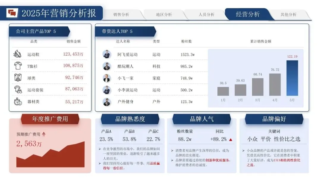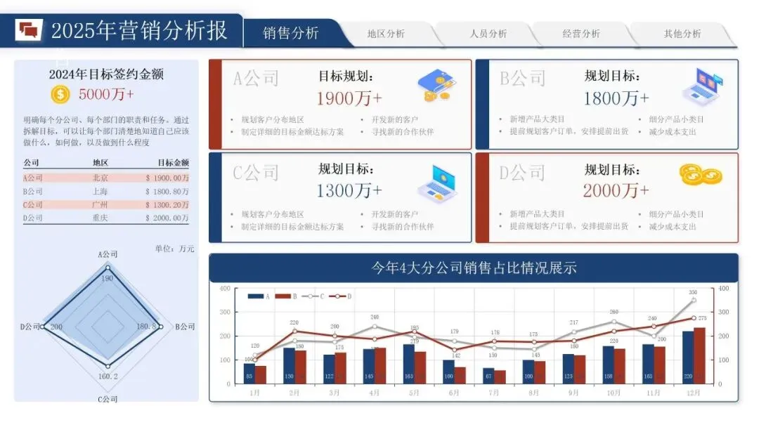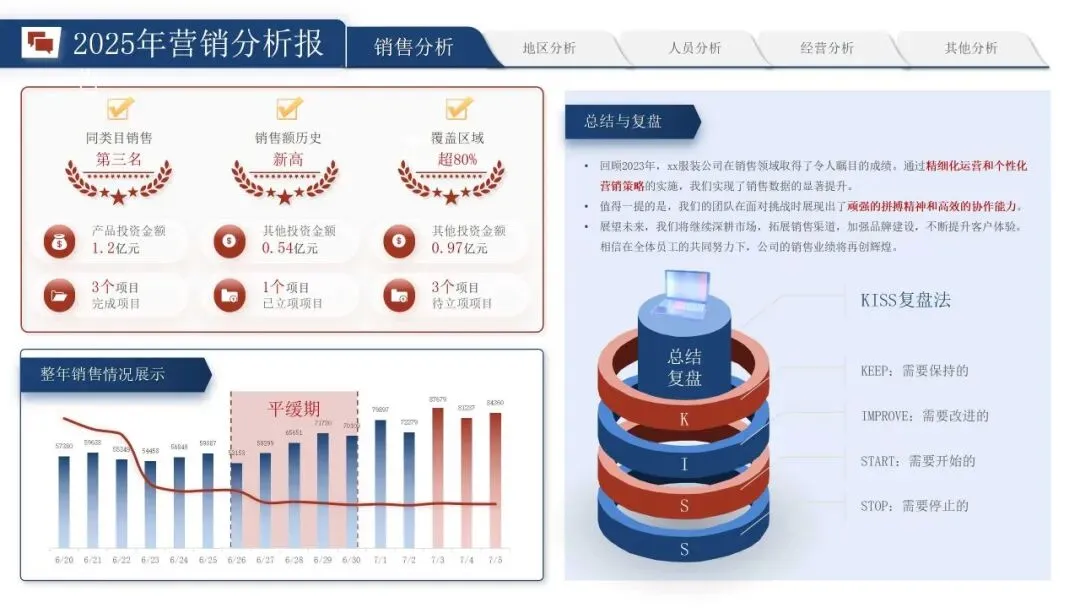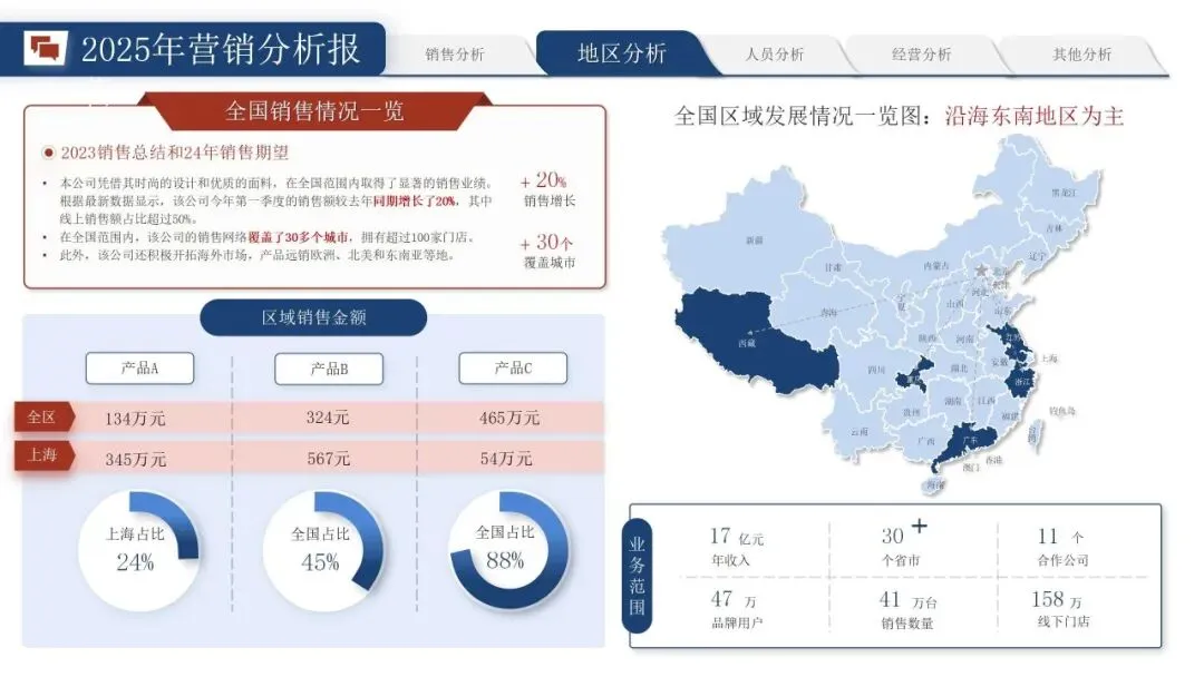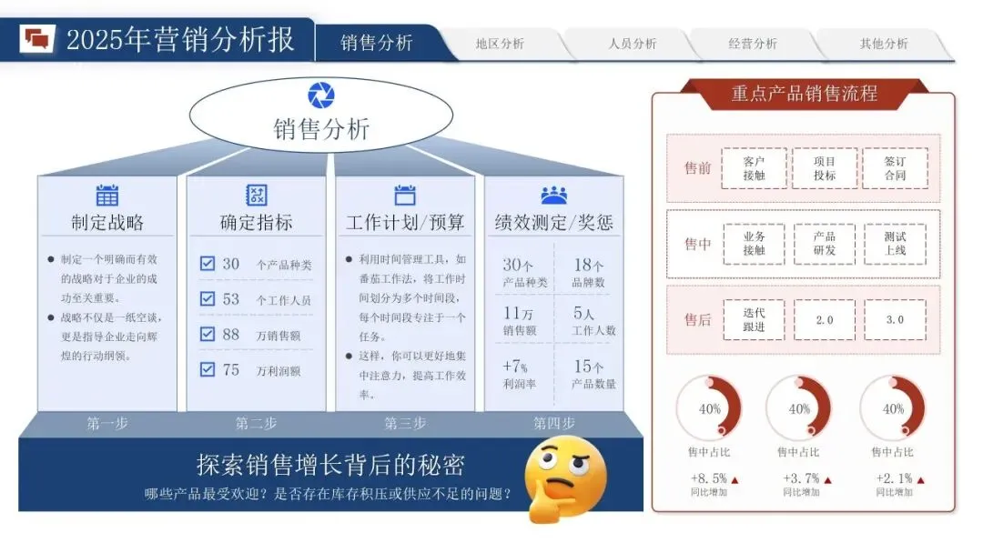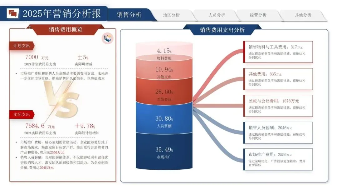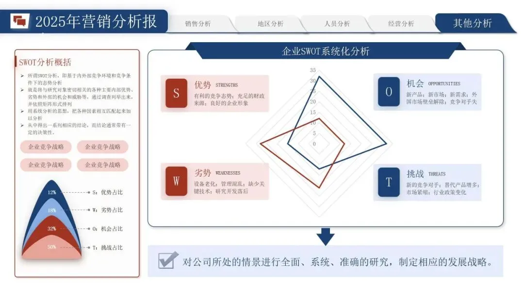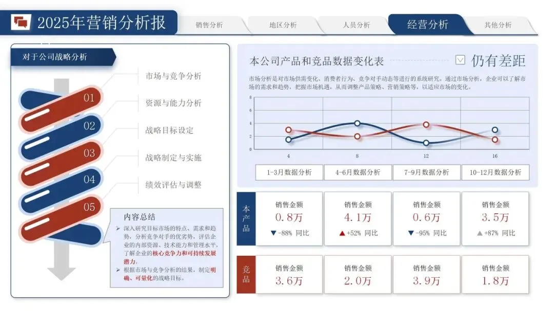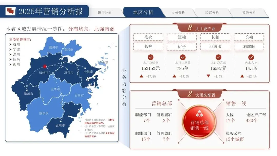 营销模型运用 KISS 复盘法、SWOT 等分析模型,拆解了各分公司、部门的目标与达成情况,明确 2025 年营销核心方向 —— 重点强化线上渠道运营,通过精准广告投放提升品牌知名度;优化销售提成机制激励员工积极性,细化产品类目并控制成本;深耕东部成熟市场的同时,布局西部、东北等潜力区域及海外市场,以数据驱动产品创新与服务升级,实现市场份额与业绩持续增长。
