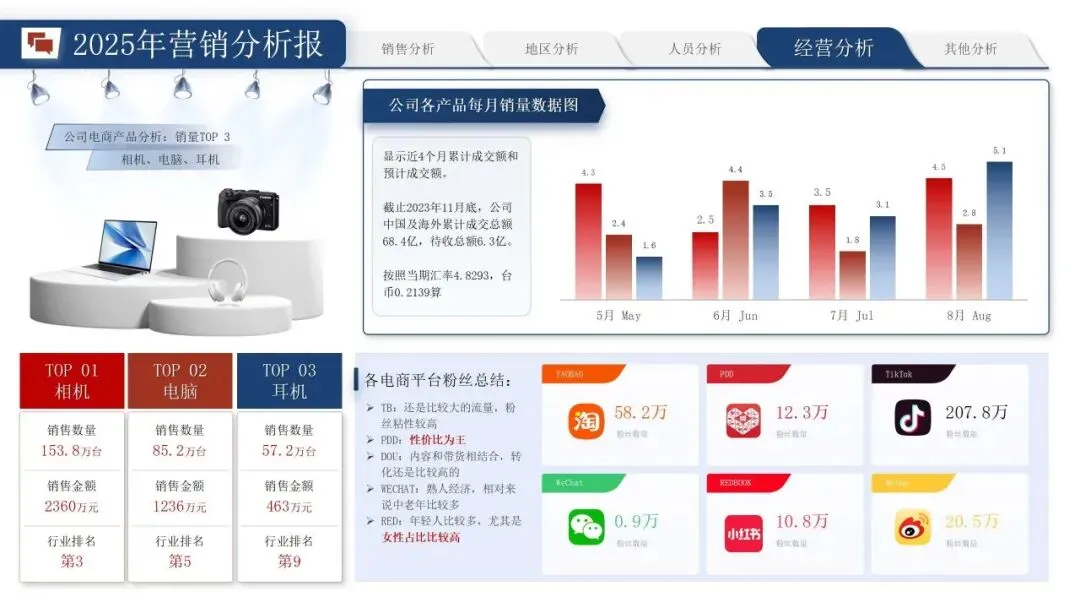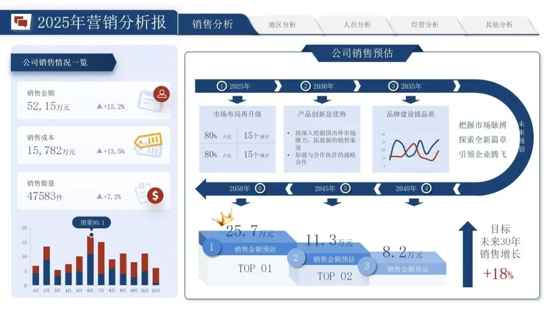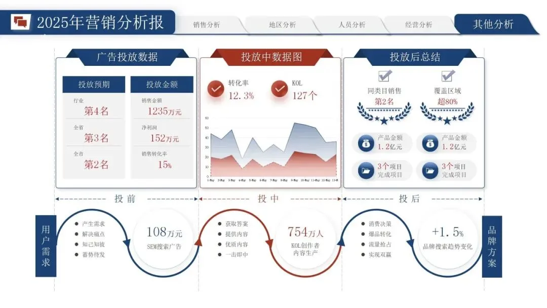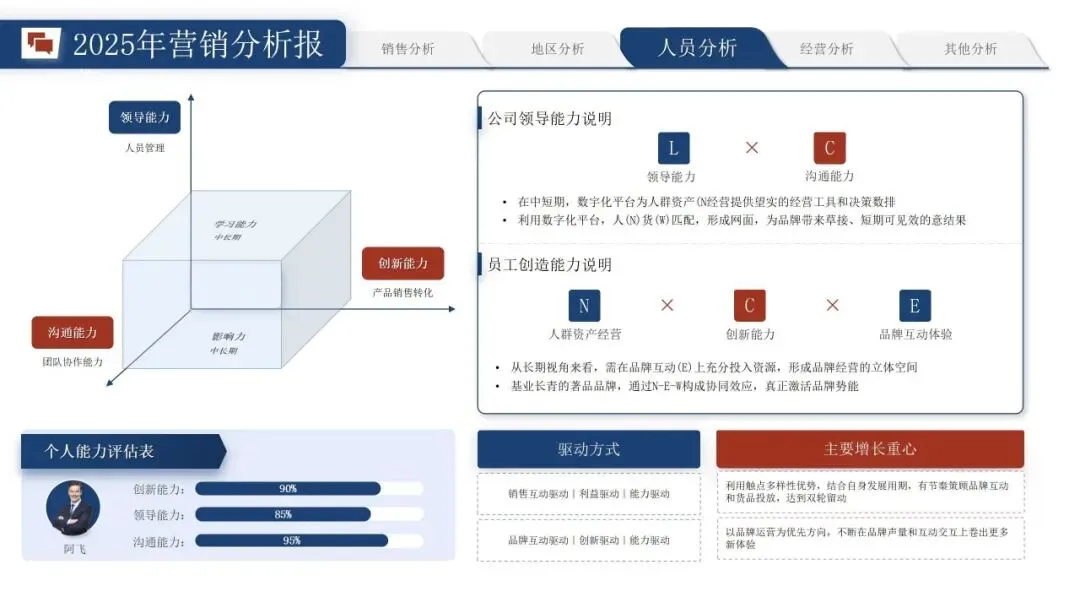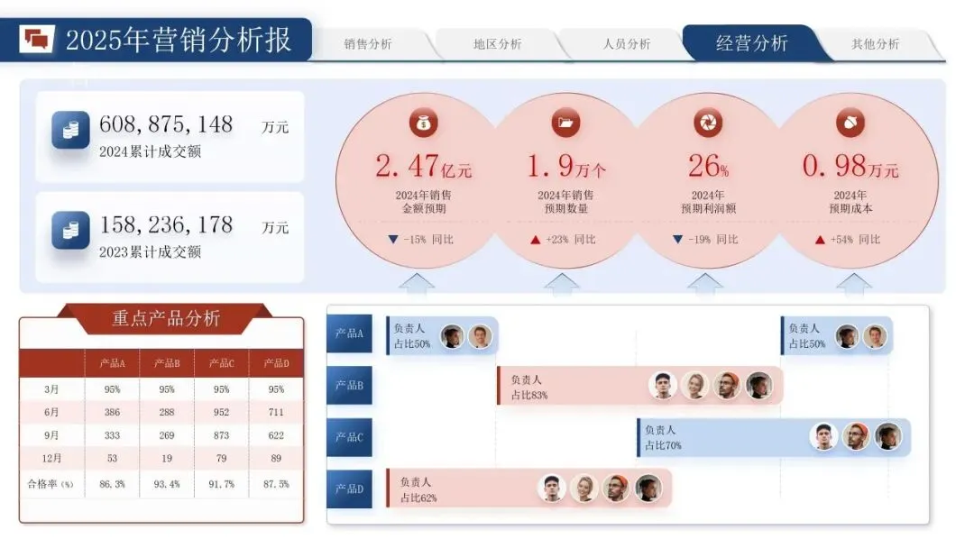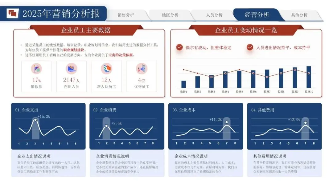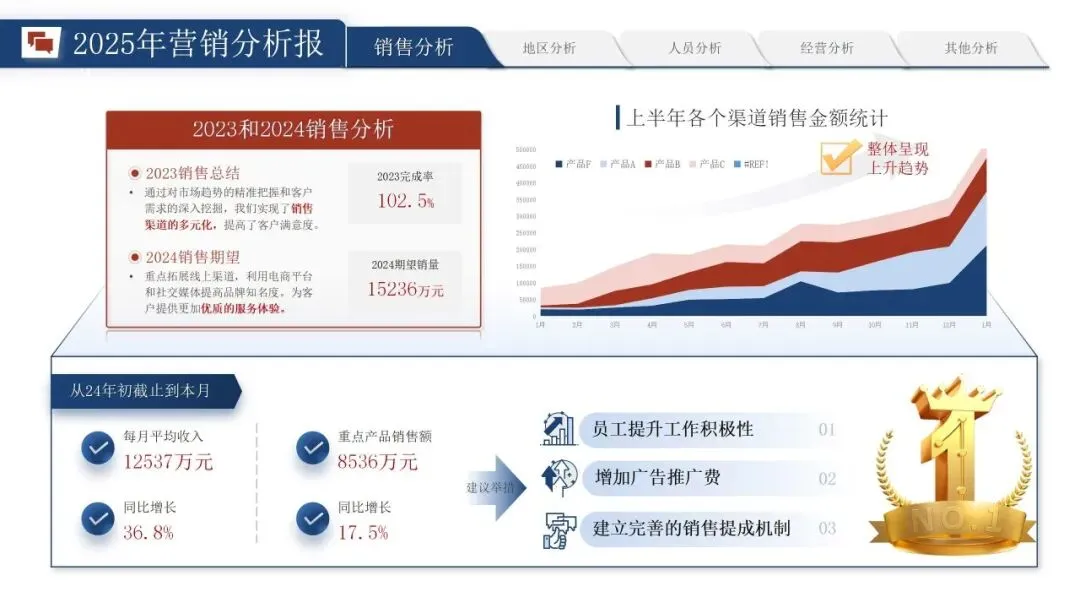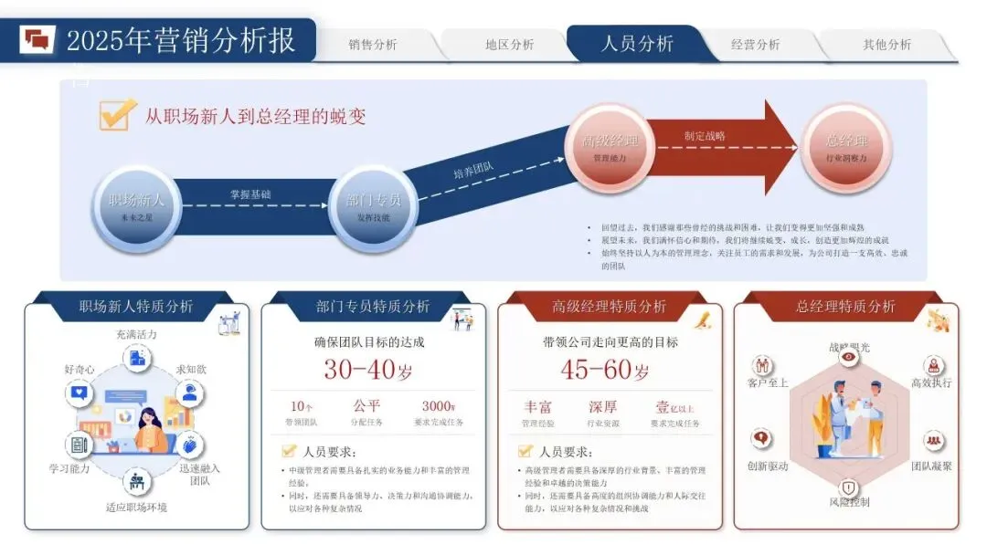 营销模型运用 KISS 复盘法、SWOT 等分析模型,拆解了各分公司、部门的目标与达成情况,明确 2025 年营销核心方向 —— 重点强化线上渠道运营,通过精准广告投放提升品牌知名度;优化销售提成机制激励员工积极性,细化产品类目并控制成本;深耕东部成熟市场的同时,布局西部、东北等潜力区域及海外市场,以数据驱动产品创新与服务升级,实现市场份额与业绩持续增长。