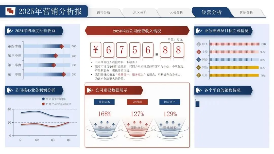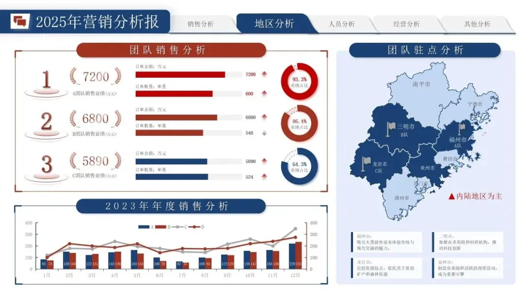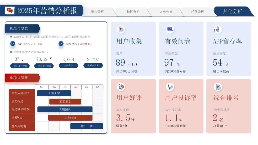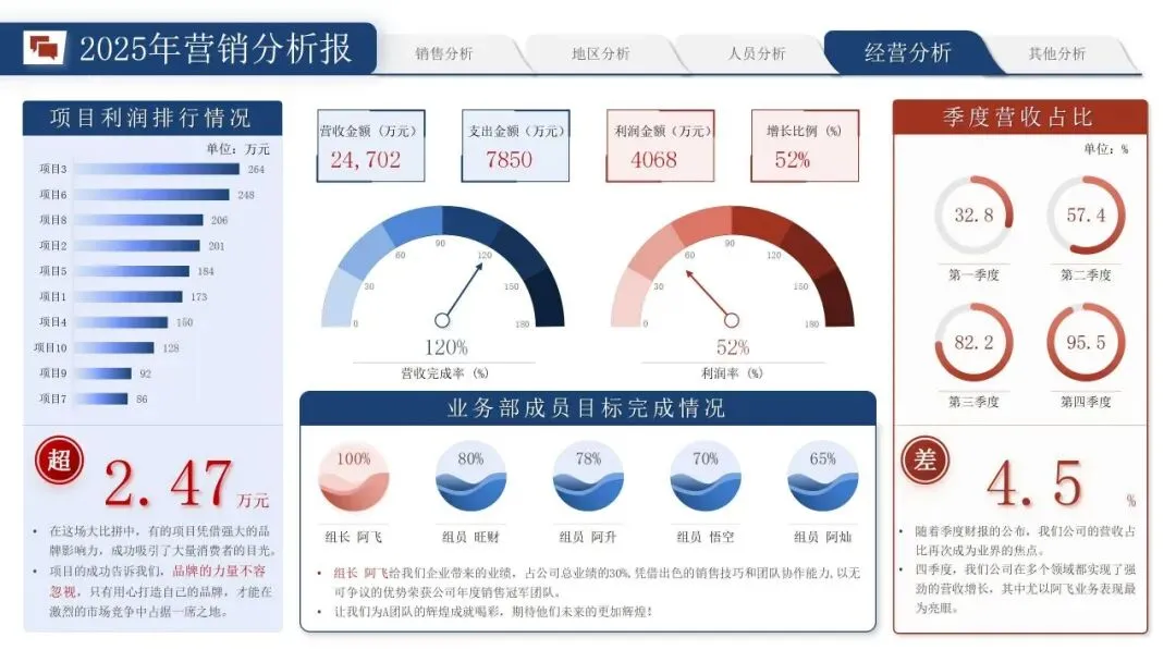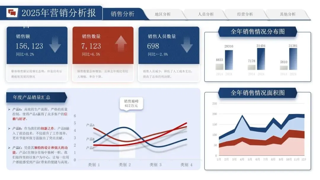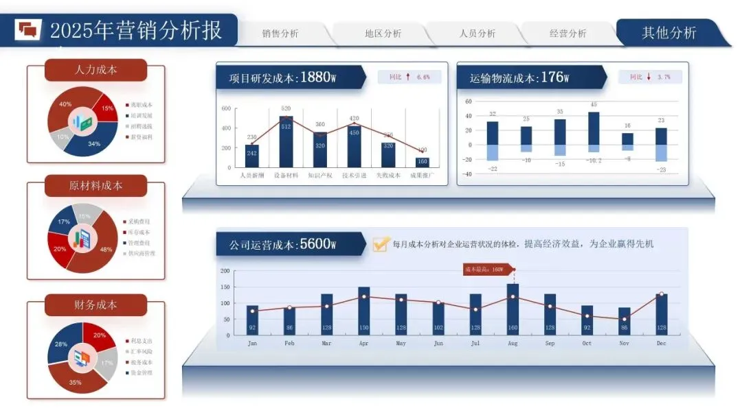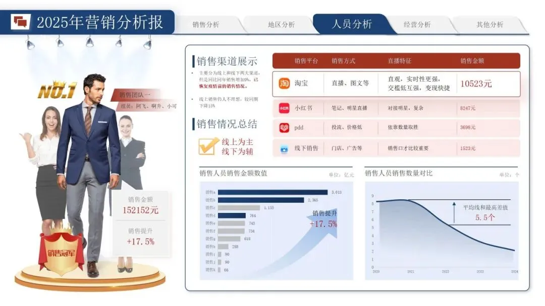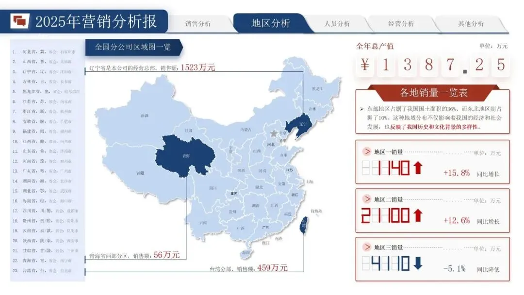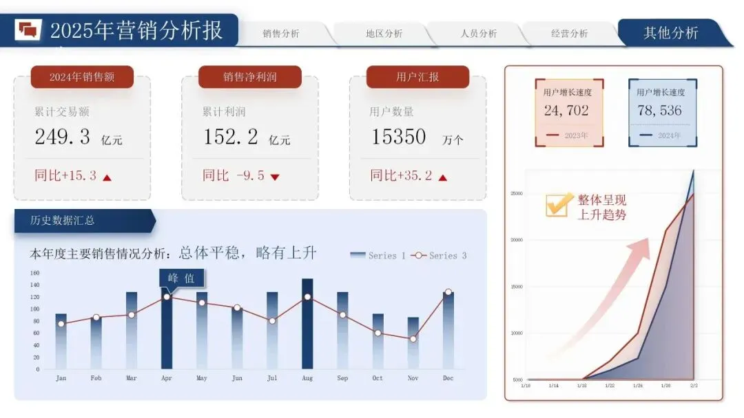 营销模型运用 KISS 复盘法、SWOT 等分析模型,拆解了各分公司、部门的目标与达成情况,明确 2025 年营销核心方向 —— 重点强化线上渠道运营,通过精准广告投放提升品牌知名度;优化销售提成机制激励员工积极性,细化产品类目并控制成本;深耕东部成熟市场的同时,布局西部、东北等潜力区域及海外市场,以数据驱动产品创新与服务升级,实现市场份额与业绩持续增长。