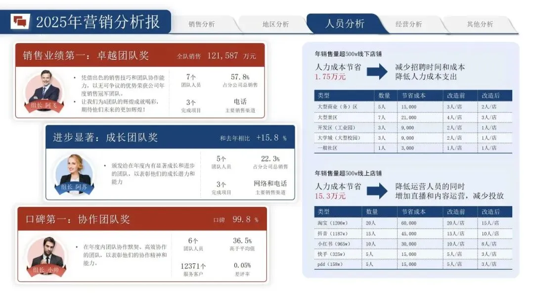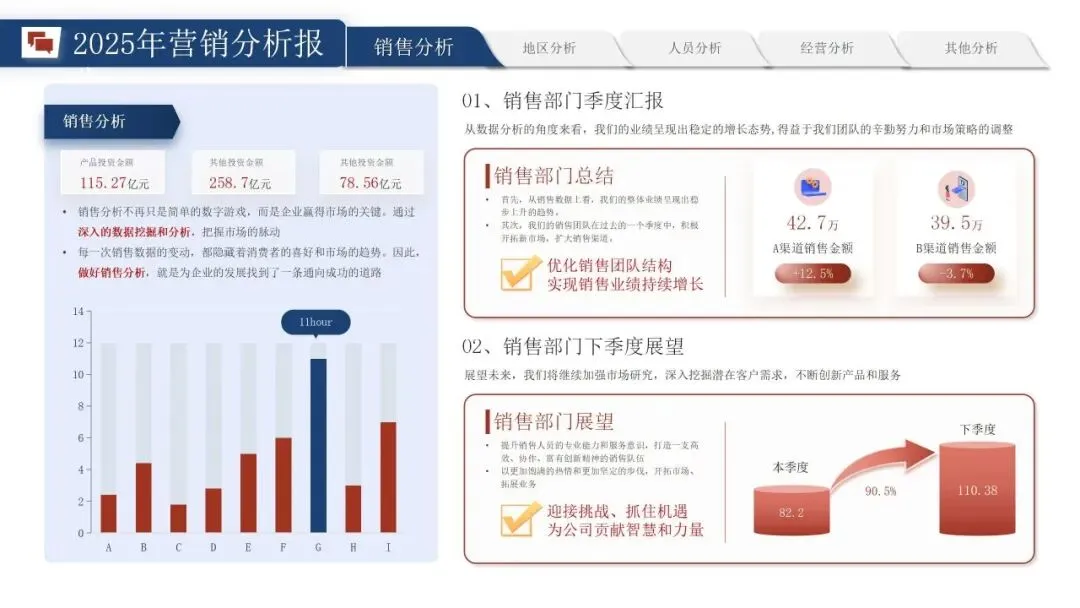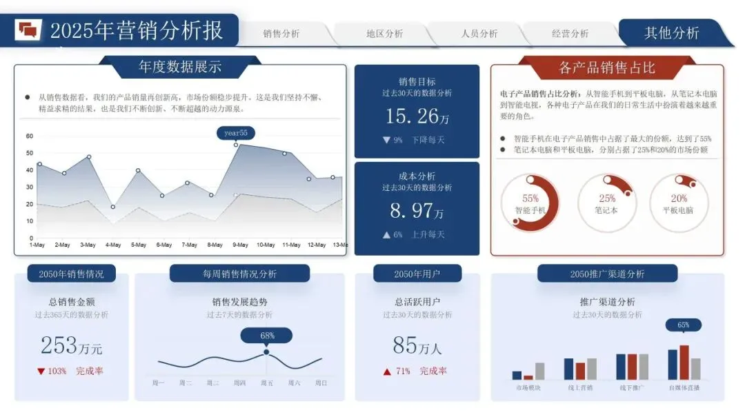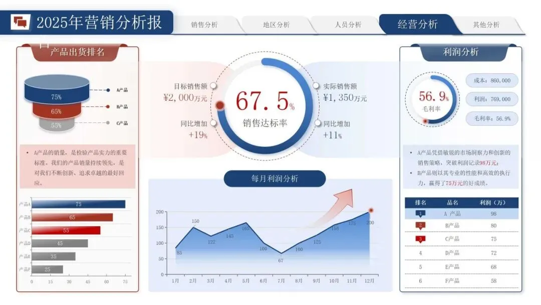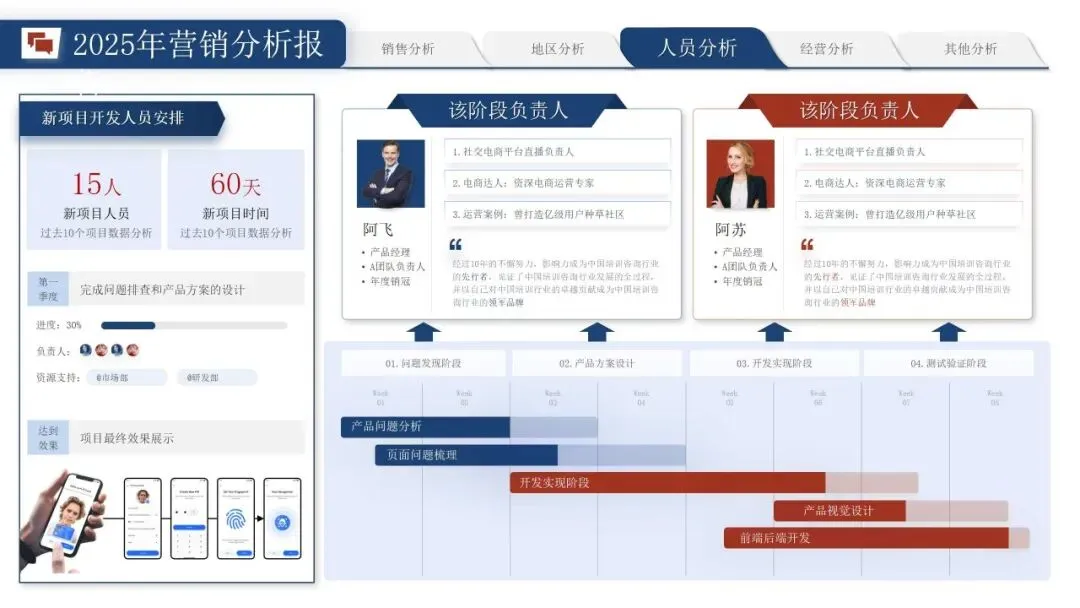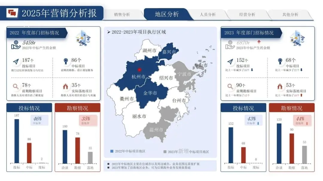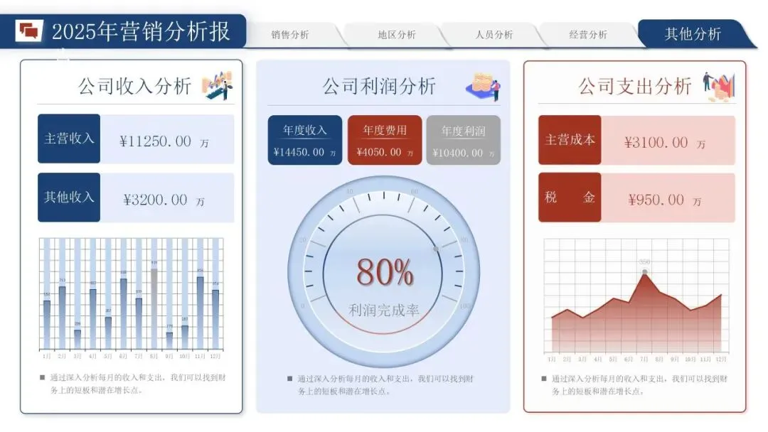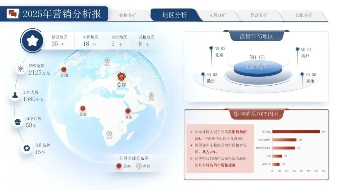 营销模型运用 KISS 复盘法、SWOT 等分析模型,拆解了各分公司、部门的目标与达成情况,明确 2025 年营销核心方向 —— 重点强化线上渠道运营,通过精准广告投放提升品牌知名度;优化销售提成机制激励员工积极性,细化产品类目并控制成本;深耕东部成熟市场的同时,布局西部、东北等潜力区域及海外市场,以数据驱动产品创新与服务升级,实现市场份额与业绩持续增长。