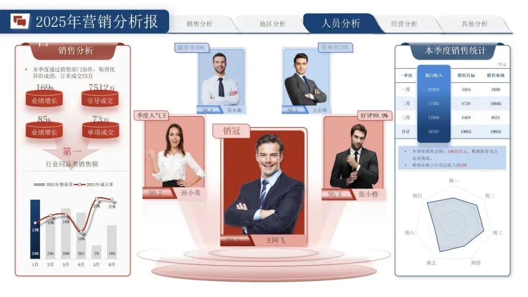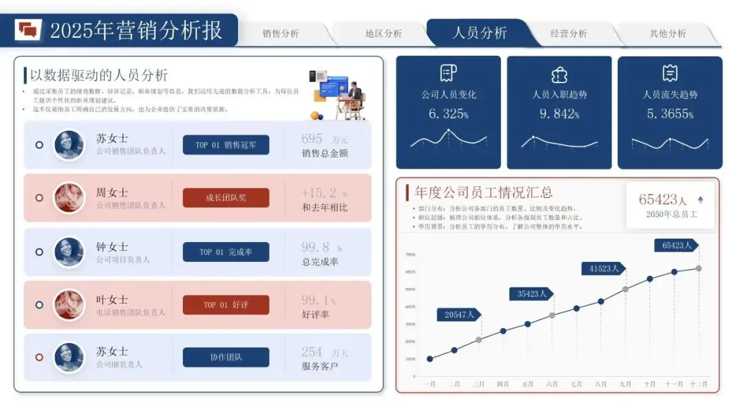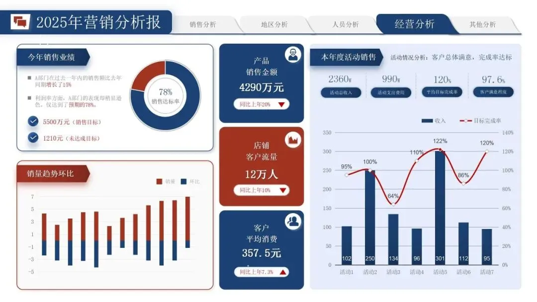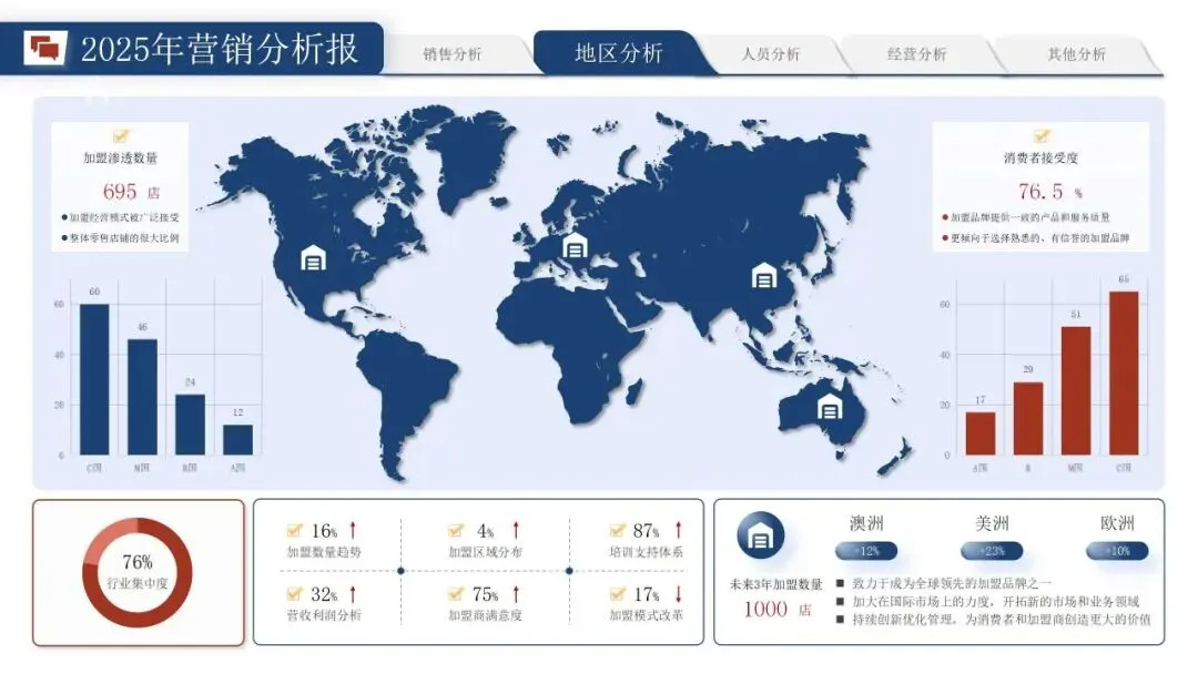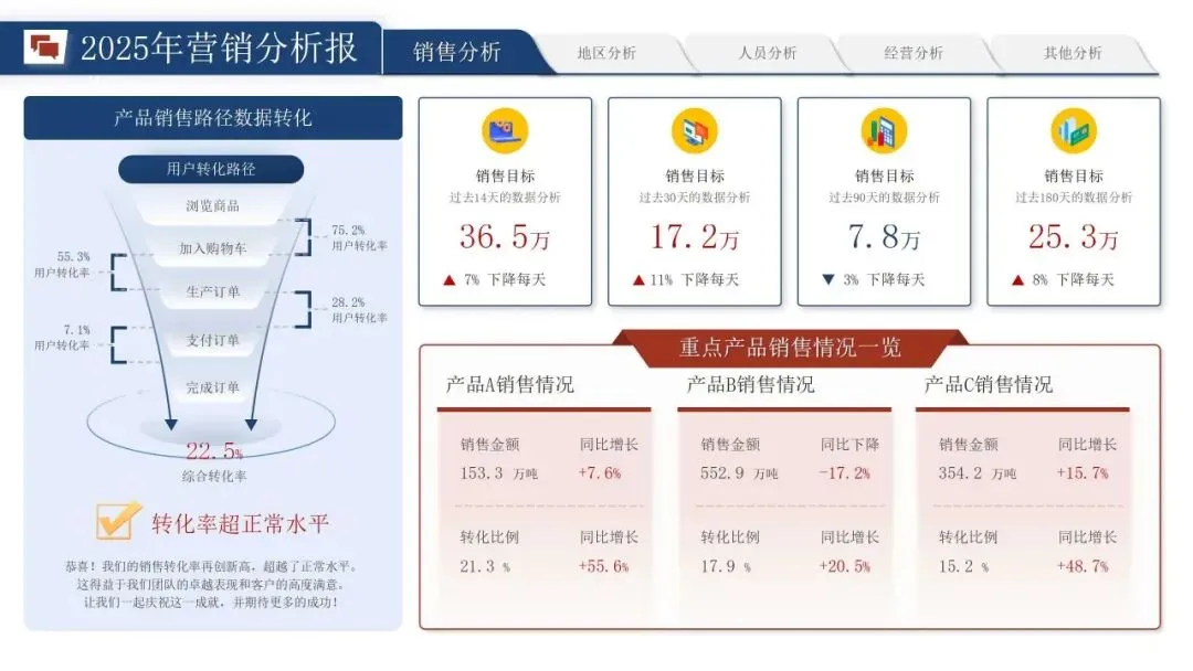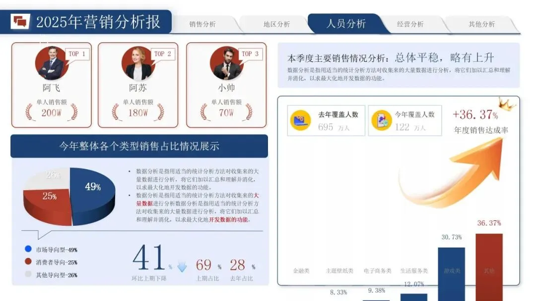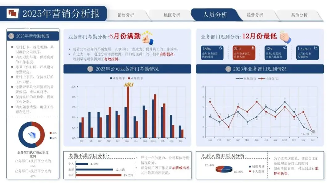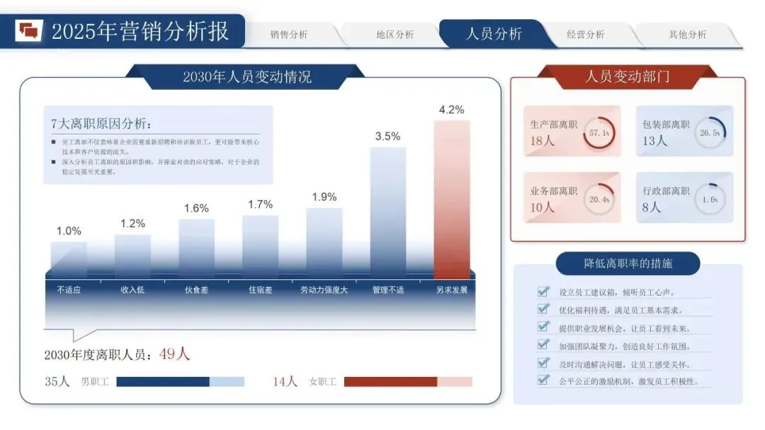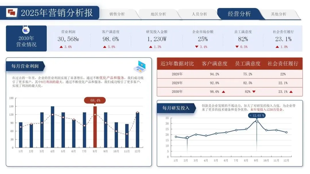 营销模型运用 KISS 复盘法、SWOT 等分析模型,拆解了各分公司、部门的目标与达成情况,明确 2025 年营销核心方向 —— 重点强化线上渠道运营,通过精准广告投放提升品牌知名度;优化销售提成机制激励员工积极性,细化产品类目并控制成本;深耕东部成熟市场的同时,布局西部、东北等潜力区域及海外市场,以数据驱动产品创新与服务升级,实现市场份额与业绩持续增长。