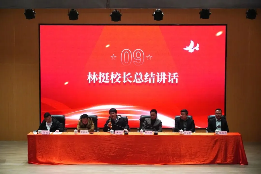 会议最后,林挺校长作总结讲话。他充分肯定了一年来全体教职工的辛勤付出与取得的显著成绩,并对新学期工作提出了明确要求:一是要坚持正确办学方向,落实立德树人根本任务;二是要深化教育教学改革,提升人才培养质量;三是要加强师资队伍建设,激发队伍活力;四是要优化管理服务体系,营造和谐育人环境。他号召全校上下凝聚共识、齐心协力,共同谱写学校高质量发展的新篇章。