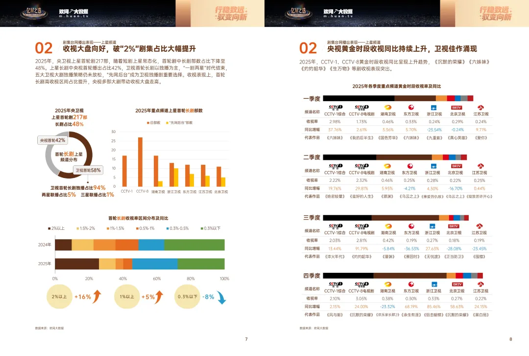 2025年,剧集收视大盘稳步向好,央卫视全年播出首轮剧217部,随着短剧上星常态化,首轮剧中长剧部数占比下降至48%。
