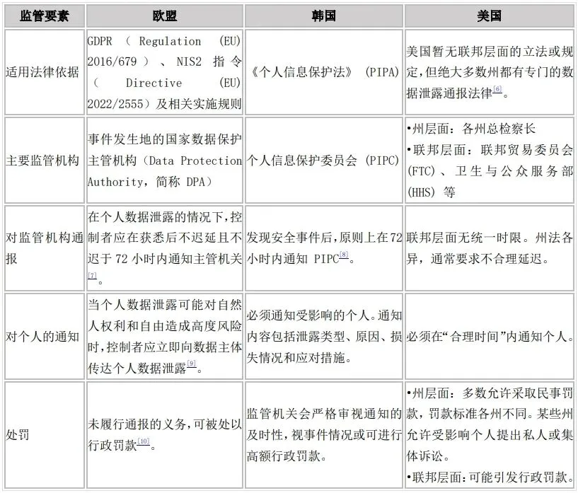 表1 韩美欧针对数据安全事件通报义务的法律规定