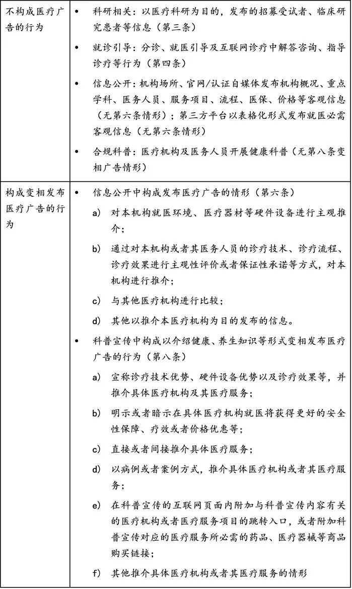 (3)综合内容、形式、效果,构建医疗广告的认定标准,并采用负面清单的方式列明构成变相发布医疗广告的情形: