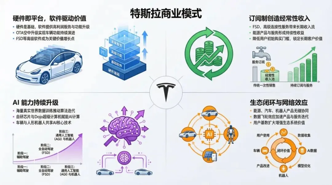 :通过订阅模式,厂商有动力持续迭代 AI 功能(如 FSD 软件不断升级,Optimus 大脑不断学习进化),以提供更佳体验并留住用户。客户始终享有最新功能,这也增强了客户黏性。 - 生态闭环与网络效应