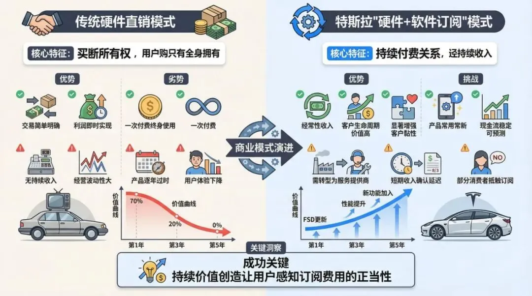 特斯拉“硬件+软件订阅”模式则开创了全新的价值交付范式:消费者购买电动车硬件作为基础平台,高级功能通过订阅逐步解锁,形成持续付费关系。这种模式带来了多重优势: