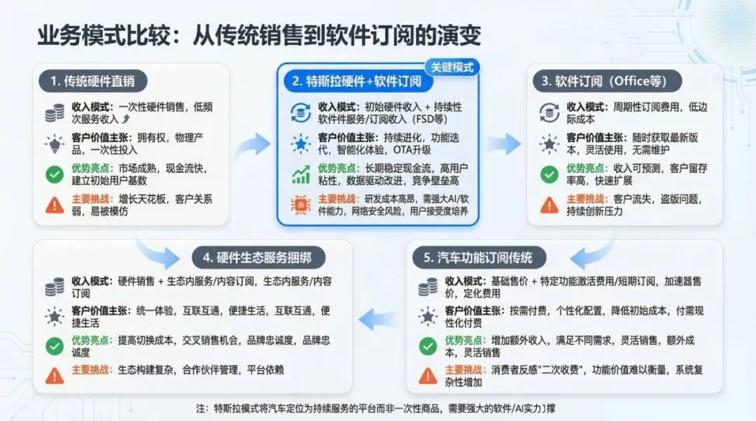 特斯拉的软硬件结合订阅模式,既不同于传统直接卖硬件的老路,也与其他行业的订阅战略有相通和相异之处。下面我们将特斯拉模式与几种典型模式进行对比,分析其相对优势和挑战。