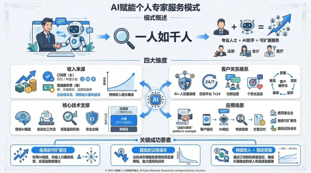这正是 AI 赋能个人专家模式的魅力所在:极高的可扩展性和超低的边际成本。一名专家通过订阅制获得持续收入,其服务又因 AI 加持而质量稳定、效率奇高,最终实现客户与创业者的双赢。