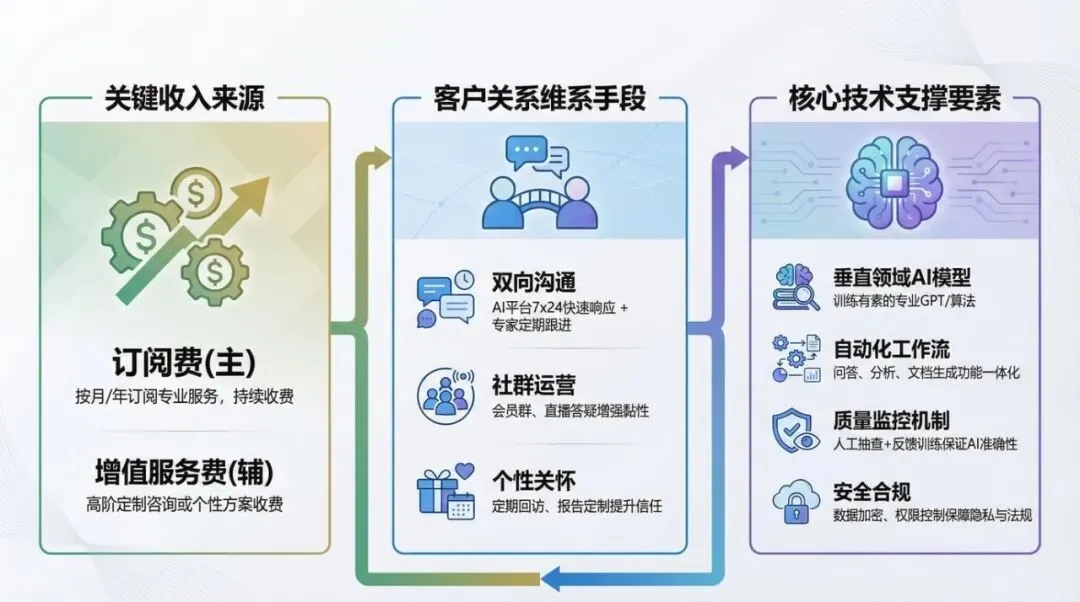 通过在线平台和个性化互动来维系客户关系。尽管 AI 处理了大部分业务,个人专家仍需定期与订阅客户沟通,提供定制化建议或检查 AI 输出,确保质量可靠。这种“AI+人”双重保障有助于建立客户信任。平台可提供仪表盘让客户查看服务进展、提出问题,并由 AI 即时响应常见需求;对于复杂问题,专家会介入处理,给客户“一对一”的关怀感。同时,通过社群运营(如订阅用户的交流群、定期直播答疑)培养用户粘性。持续的内容更新也是关键——根据 AI 分析的用户数据,定期向客户推送有价值的报告、提示或新功能,让客户感知到服务在不断进步,从而愿意续订。