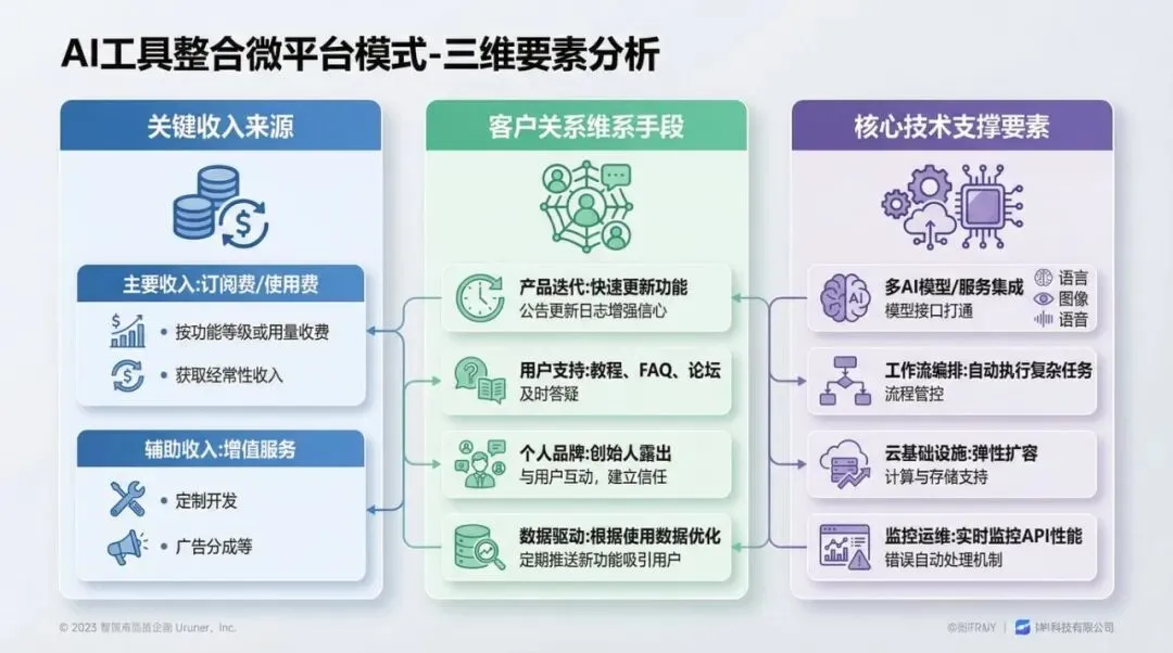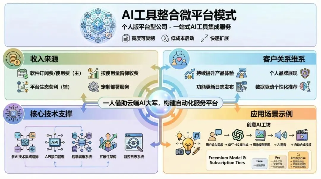 此模式侧重技术型个人创业者,打造一个集成多种 AI 工具的“一站式平台”来服务特定人群或行业。可以把它看作个人版的“平台型公司”:创业者并非提供某一专业内容,而是整合不同 AI 能力为用户赋能,自己充当“产品经理+开发运维”的角色。通过调用现有 AI API 或开源模型,将文本生成、图像生成、数据处理、自动化流程等功能模块化组合,形成面向特定场景的解决方案,然后以 SaaS 形式提供给用户使用。