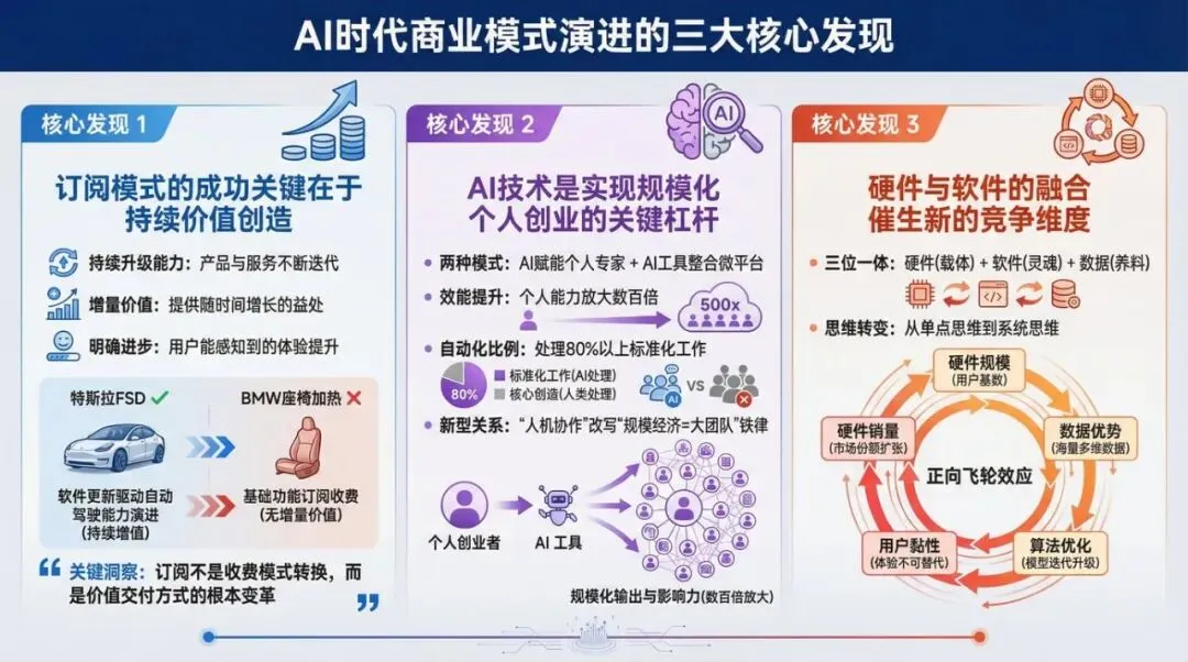 通过对特斯拉商业模式的深入剖析以及“一人公司”创新模式的构想,本报告揭示了 AI 时代商业模式演进的核心逻辑:从一次性交易转向持续服务关系,从硬件销售转向价值持续创造。这一转变不仅重塑了传统行业的竞争格局,更为个体创业者开辟了前所未有的机遇空间。