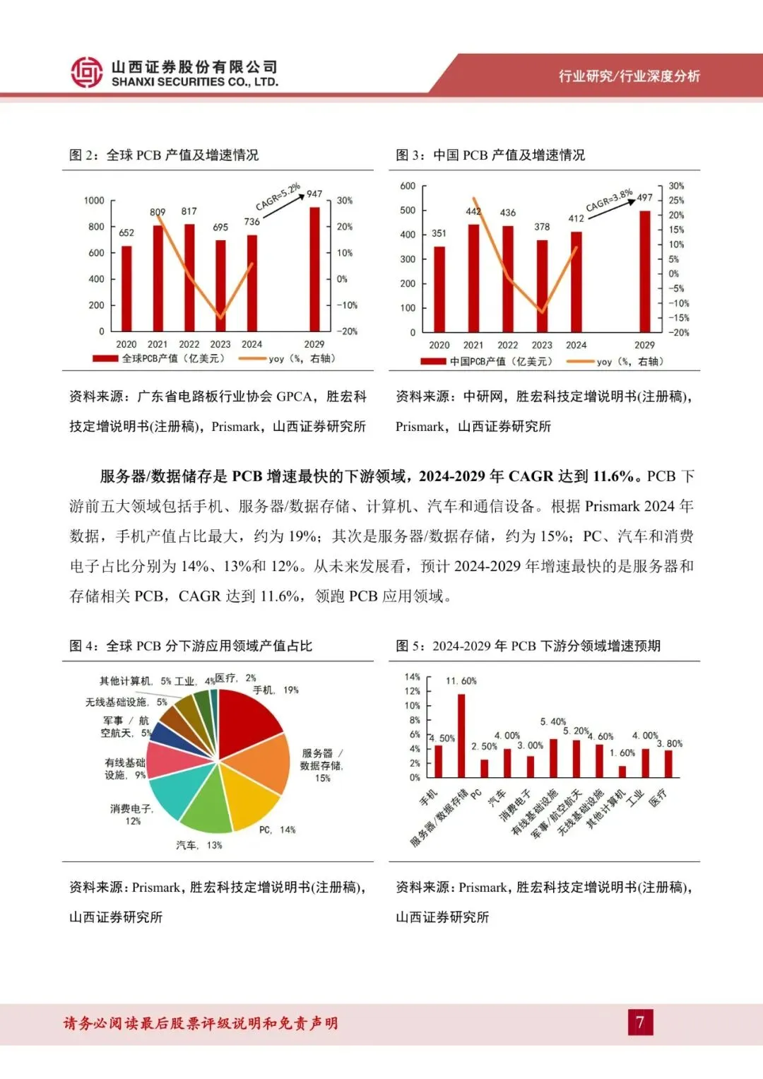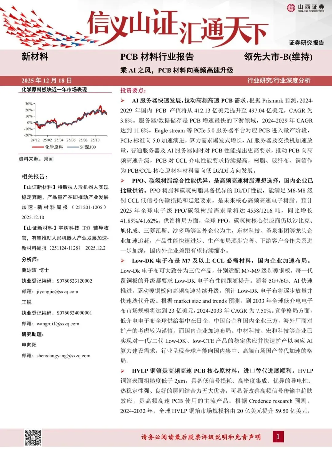 报告认为AI服务器爆发正把PCB产业推向“高频高速”新阶段,2024-2029年全球PCB产值CAGR 5.2%增至947亿美元,其中服务器/数据存储领域CAGR 11.6%最快。PCIe5.0、800G/1.6T交换机、GPU载板对介电性能要求陡升,驱动上游CCL及三大核心原材料——树脂、玻纤布、铜箔同步升级;国产厂商在PPO/碳氢树脂、Low-DK电子布、HVLP铜箔等环节已打破海外垄断,进入放量窗口。