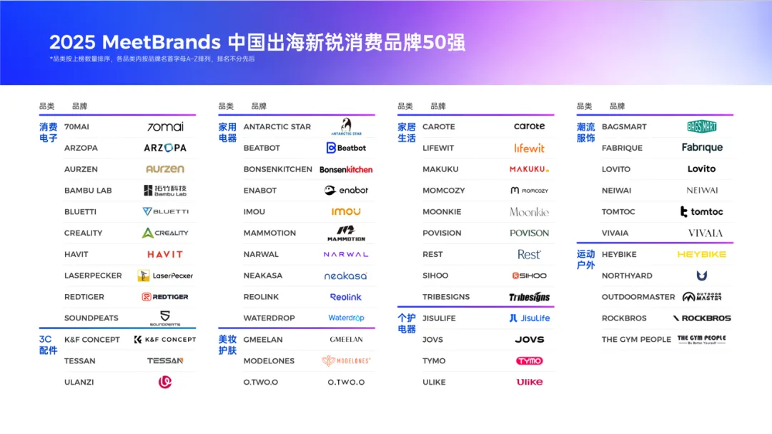 飞书深诺集团旗下、专注电商与品牌出海的营销服务品牌飞书点跃 BeyondClick,携手益普索发布《2025 MeetBrands 中国出海新锐消费品牌榜单报告》。在「2025 MeetBrands 中国出海新锐消费品牌 50 强」中,我们看到,那些在激烈竞争中成功突围的新锐品牌,虽路径各异,却在关键战略选择上展现出相似的判断与思考,这些共性,或许正是中国品牌穿越周期的重要线索。