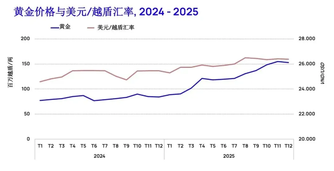 与证券市场并行,黄金价格持续确立新一轮价格水平,达到1.528亿越盾/两(与年初的7740万越盾大幅上涨)。总之而言,2025年金价涨幅接近97%,正式从传统“避险资产”逐步转变为“投资资产”。