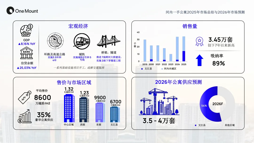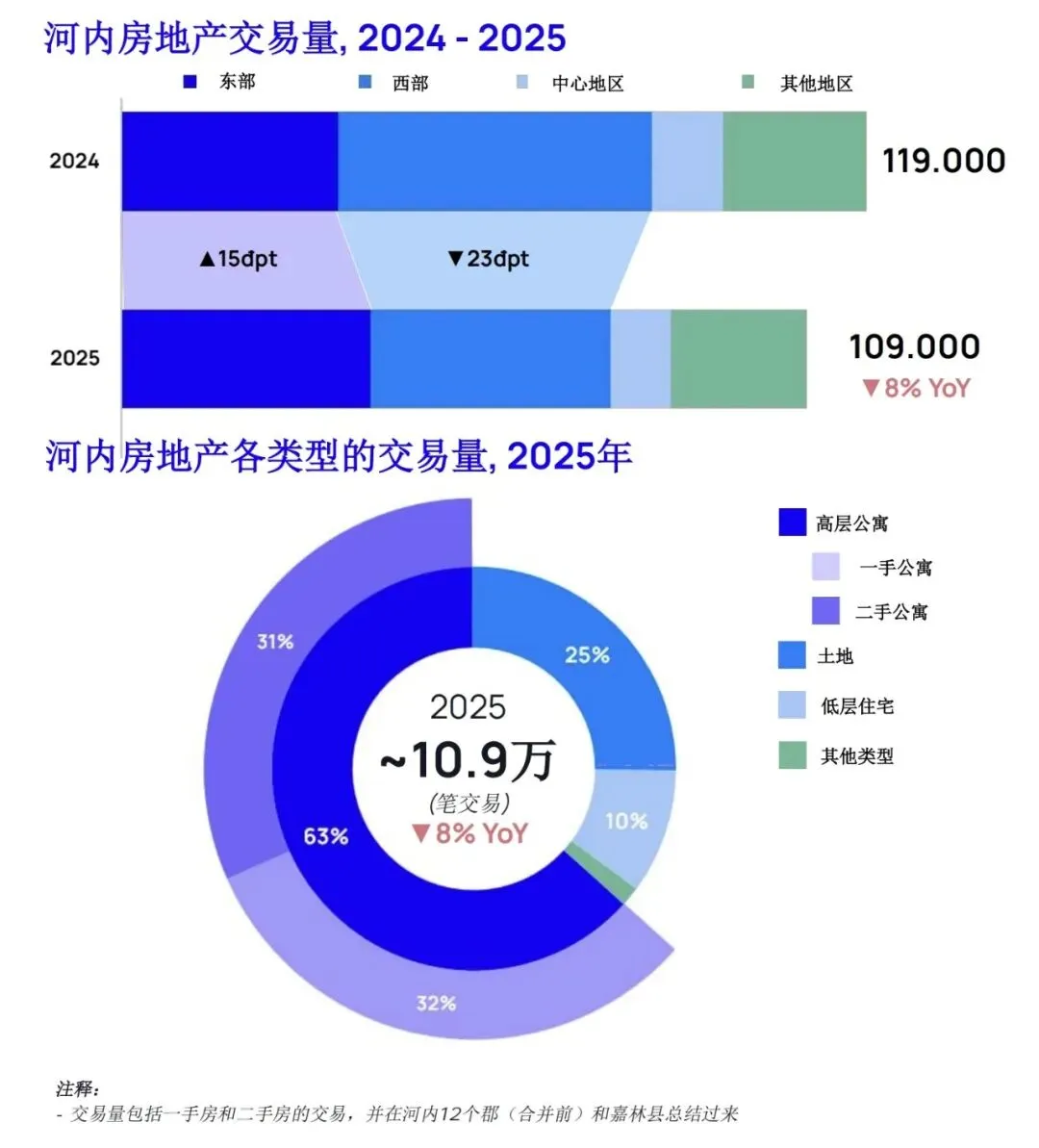2025年河内全市场共录得10.9套,同比小幅下降8%。其中,东部地区上升15个百分点,西部地区下降23个百分点。公寓持续引领市场,占总交易量的63%,得益于一手和二手市场的交易均大幅上涨。