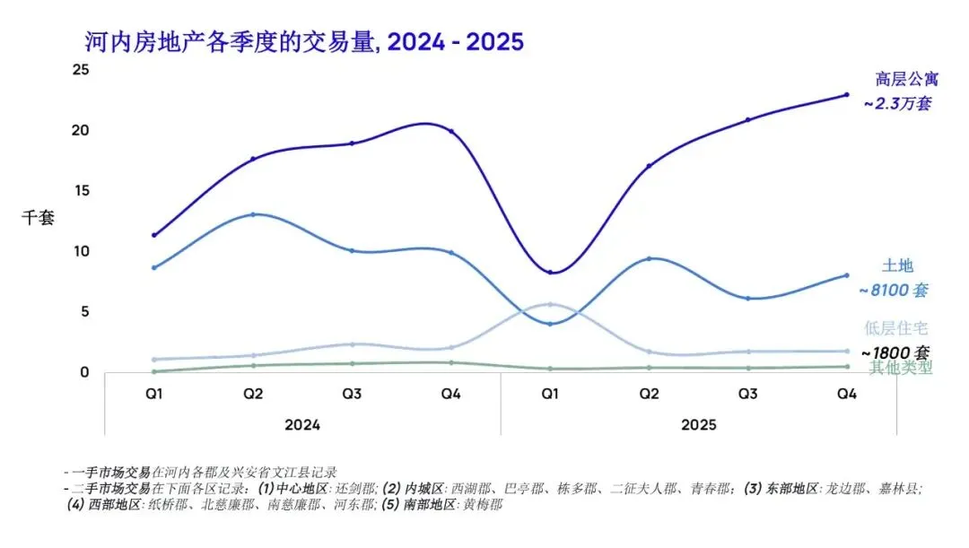 河内公寓市场自2025年第一季度起持续增长,其中二手市场在前三个季度的流动性高于一手市场。然而,到2025年第四季度,市场走势明显分化:二手公寓成交量回落至约9500套(环比下降22%),而一手市场成交量大幅提升至约1.3万套(环比增长31%)。
