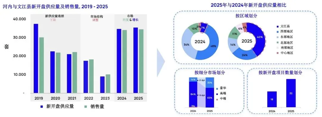 2025年是河内公寓市场进入增长周期的第二年,供应量和交易量较2024年同期增长约2%,分别达到约3.55万套和3.45万套。然而,2025年的市场供应结构呈现出多项值得关注的变化: