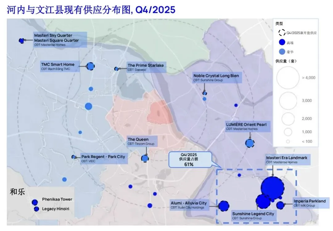 文江县预计将占据约54%的市场新增供应份额,并在 Vinhomes Ocean Park 2–3、Alluvia City、Sunshine Legend City、Ecopark 等大型城市综合体进入下一阶段开发的推动下,持续引领市场供应走向。