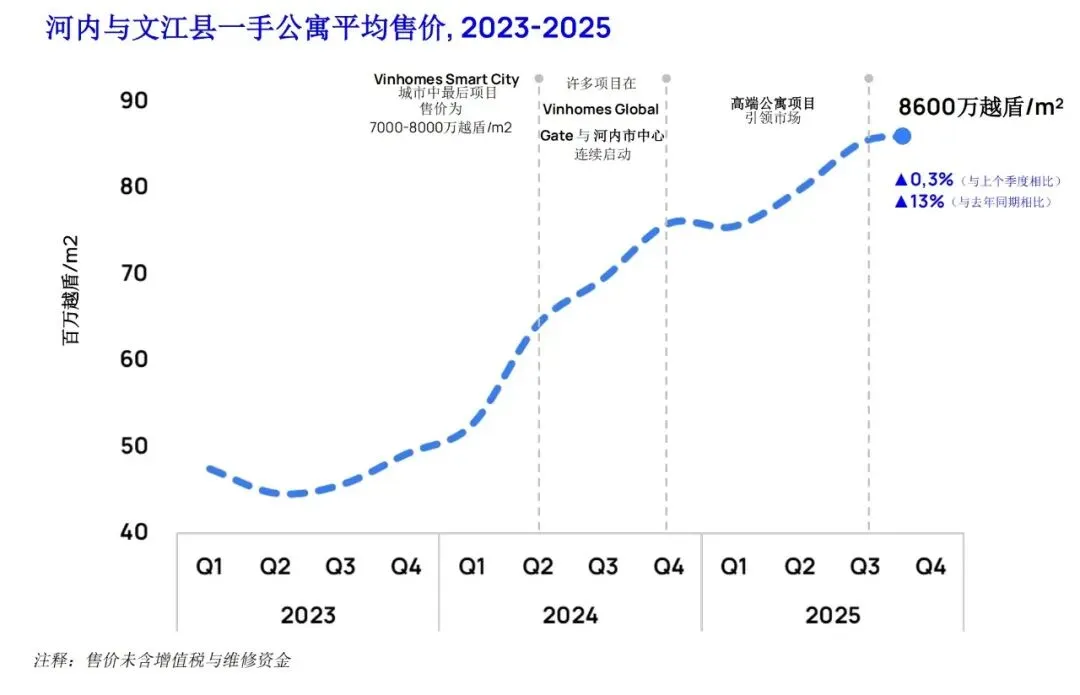 截至2025年底,河内公寓一手市场在连续三个季度上涨后,首次出现价格横盘走势,均价稳定在约每平方米8600万越盾。尽管如此,售价仍比去年同期上涨13%。此次价格企稳主要得益于文江县的大量新增供应。该区域近期价格保持横盘,项目售价普遍在每平方米6000万–7000万越盾之间,仅相当于河内内城区平均价格(约每平方米1.09亿越盾)的约62%。