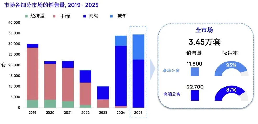值得关注的是,高端及豪华公寓两大细分市场均录得较高吸纳率,分别达到87%和93%。其中,豪华公寓表现尤为突出,全年交易量达1.18万套(为2024年的2.4倍),显示市场在高价位背景下仍处于积极吸纳阶段。