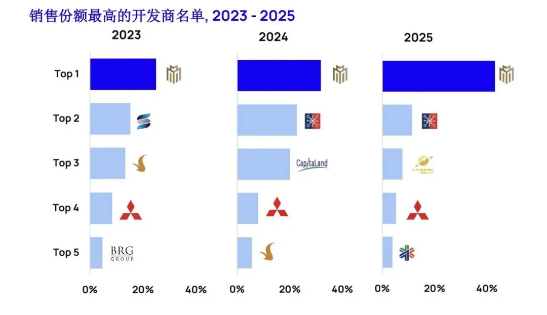 尽管市场在供应结构及产品分化方面出现多重波动,Masterise Homes 仍连续三年(2023–2025)稳居河内一手公寓市场销售份额首位,主要得益于其在东部、西部及北部区域新开项目所取得的高吸纳率。