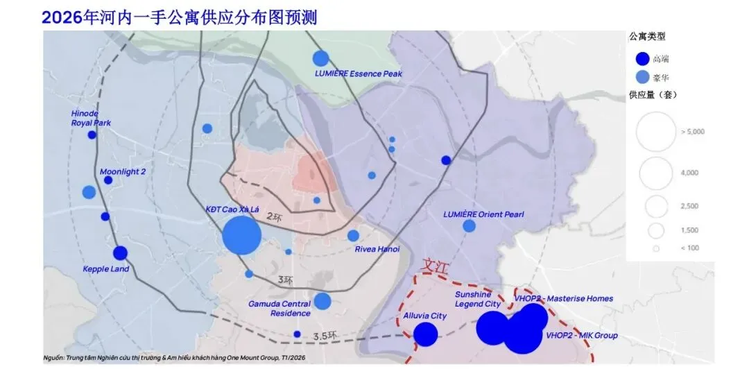 预计2026年市场将录得约3.5–4万套新公寓供应。高端及豪华公寓占比预计小幅上涨,主要集中在3.5环区域。相比之下,3.5环之内区域大部分为豪华项目,售价高于1亿越盾/平米。这一现象反映出不同区域之间日益明显的价格分化,同时也体现了房地产项目及基础设施开发向新城的发展趋势。