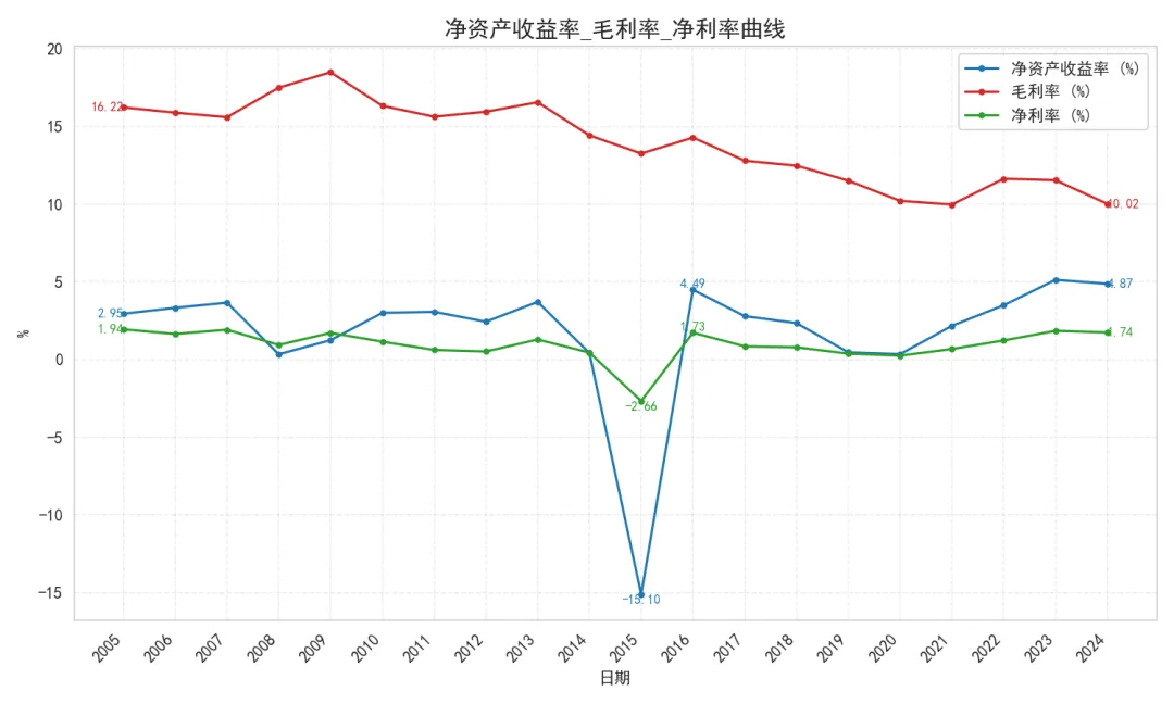 各行业参考值:银行等金融机构(90% - 95%),重资产行业(50% - 70%),轻资产行业(30% - 50%),房地产行业(70% - 85%)经营与盈利表现: 2015年亏损后,公司2016年扭亏为盈,但净利润长期低位徘徊,2020年仅0.45亿元。2021年起盈利逐步修复,2023年净利润达6.88亿元,扣非净利润同步回升至3.93亿元,销售净利率从2020年0.25%升至2023年1.85%,盈利能力显著改善。