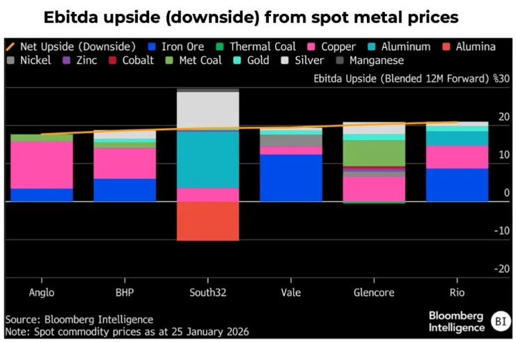 如果当前价格水平保持不变,主要多元化矿业公司未来一年的预期EBITDA将有18%至21%的上涨空间,这将是自2025年初以来最大的盈利增长空间。彭博行业研究指出,力拓和嘉能可表现最佳,预期上涨空间约为20%至21%。