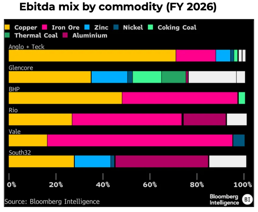 彭博行业研究预计,2026年多元化矿业公司的EBITDA将全面增长,其中嘉能可和英美资源集团的增幅预计在24%至28%之间。