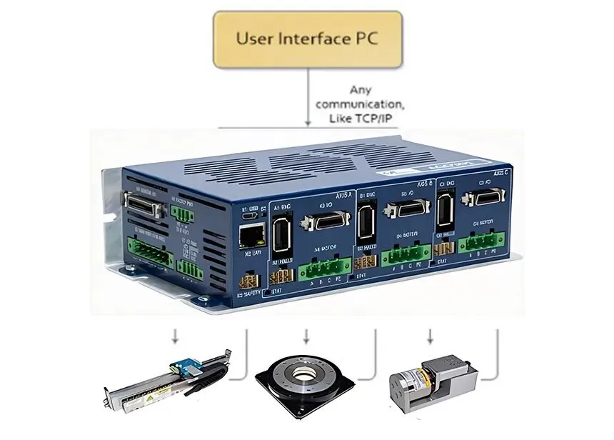 雅科贝思自主研发的AGM800(Century系列)多轴同步控制器,采用独特的Central-i星型总线架构。该设计将核心控制算法集中于主站,驱动单元专注于功率放大,不仅大幅提升了多轴系统的同步精度与实时性,还有效降低了系统整体成本。在开发友好性上,该控制器支持C/C++、C、Python、LabVIEW等多种主流语言,并提供了自研类C语言IDE、无代码编程等四种灵活开发方式,其编程逻辑与ST语言相近,用户通过简单培训即可快速上手,显著缩短了设备集成与工艺研发周期。