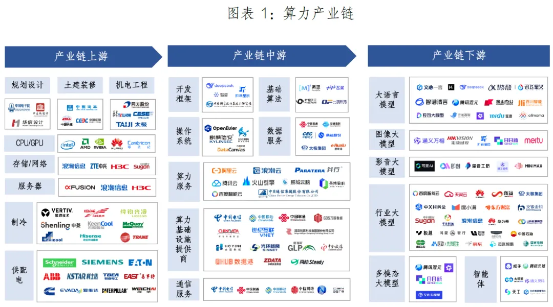 上游为硬件基础设施层,核心是芯片领域,英伟达主导的GPU是人工智能训练主力,英特尔、AMD等企业构成异构计算生态,3nm、2nm先进制程、Chiplet技术等是突破算力瓶颈的关键方向,中国国产芯片替代进程加速;服务器领域AI服务器需求激增,高密度设计、液冷散热技术等成发展趋势;高速存储技术与互联网络是算力集群高效协同的保障。