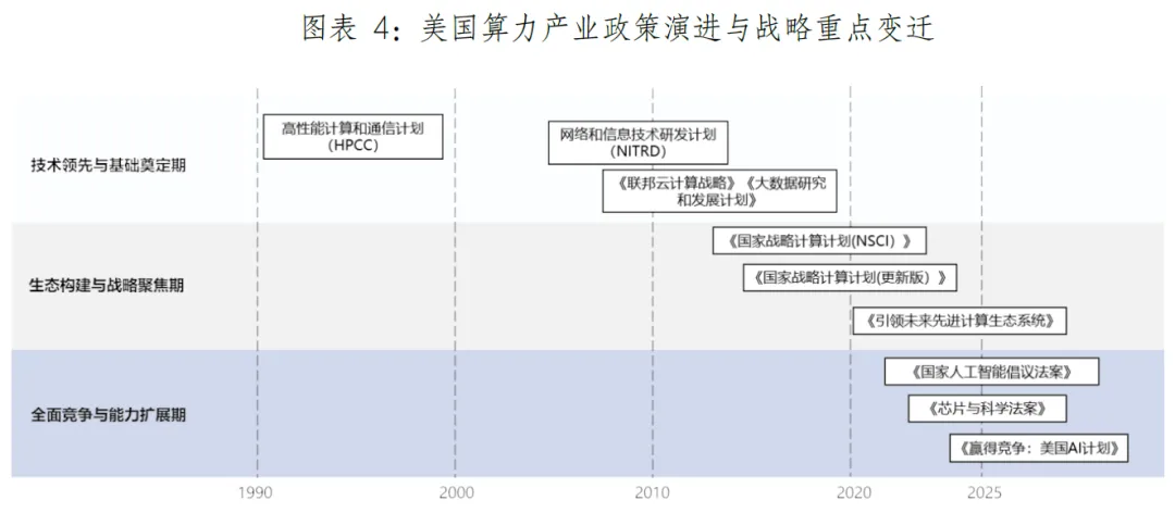 美国将算力基础设施视为国家战略竞争力核心支柱,政策演进历经三阶段:1990年代至2010年前后为技术领先与基础奠定期,出台高性能计算和通信计划(HPCC)、网络和信息技术研发计划(NITRD)等,2011年《联邦云计算战略》和《大数据研究和发展计划》将算力相关产业提升至国家战略高度;2015年至2020年为生态构建与战略聚焦期,启动国家战略计算计划(NSCI),提出构建计算生态系统,将算力与国家创新能力、经济竞争力、国家安全绑定,布局量子计算等新兴方向;2022年至今为全面竞争与扩张阶段,《芯片和科学法案》提供527亿美元半导体制造业直接补贴及约2000亿美元科研经费,2025年1月宣布“Stargate”人工智能基础设施投资计划,投入5000亿美元建设数据中心及超级计算中心。