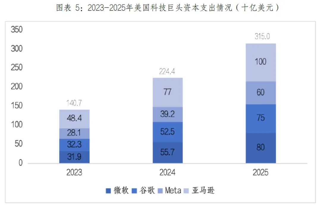 产业投入方面,全球科技巨头加大AI算力相关资本支出。微软2025财年计划投入约800亿美元,亚马逊达1000亿美元,谷歌约750亿美元,Meta上调至640–720亿美元,阿里巴巴宣布未来三年投入3800亿元人民币,重点布局算力中心等领域。