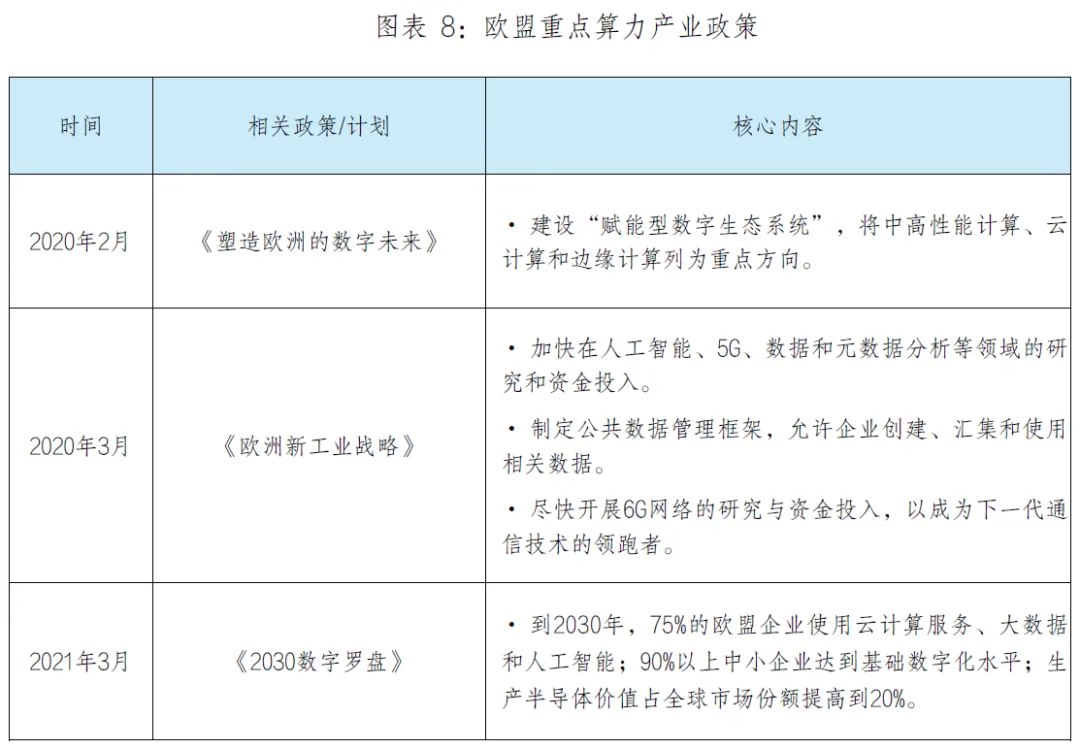 欧盟将算力基础设施建设视为数字主权核心要素,政策围绕“数字化转型”展开。2020年初发布《塑造欧洲的数字未来》等文件,提出建设“赋能型数字生态系统”;2021年3月《2030数字罗盘:欧洲数字十年之路》引导算力基础设施向分布式架构演进,设定2030年数字化目标;2022年2月《欧洲芯片法案》提出将全球市场份额从10%提升至20%,规划超430亿欧元投资;2018年通过“高性能计算共同计划”,成立欧洲高性能计算联合执行体,2020年将量子计算基础设施纳入重点工作,拟投资80亿欧元支持前沿计算研究。
