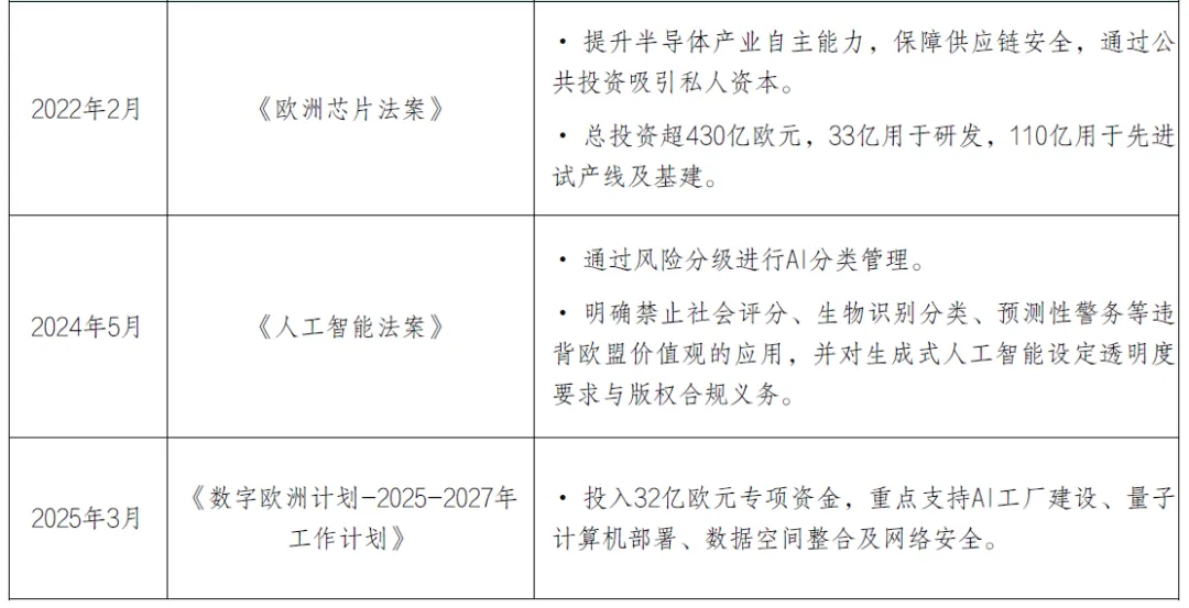 欧盟还通过《数字服务法案》《数字市场法案》等塑造公平竞争环境,正在制定“下一代计算战略”,加大对新兴方向的投入。欧盟推出一揽子人工智能创新计划,包括计划在2025年初启动首批人工智能工厂建设,为生成式人工智能模型开发提供计算、存储和数据等服务。