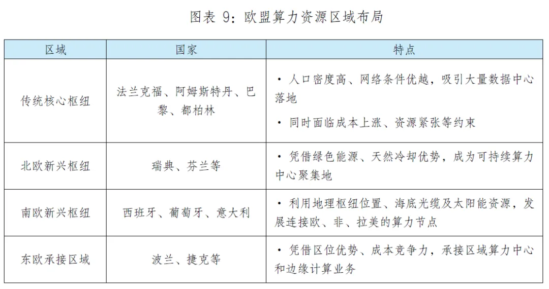 北欧地区凭借绿色能源、天然冷却优势,成为可持续算力中心聚集地;南欧伊比利亚半岛利用地理枢纽位置、海底光缆及太阳能资源,形成新的算力供给集群;东欧波兰、捷克等凭借区位优势和成本竞争力,承接区域算力中心和边缘计算业务。