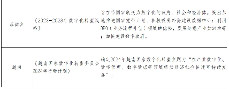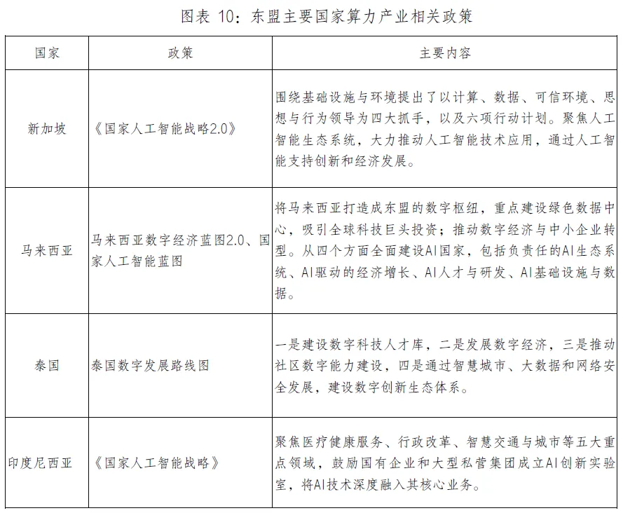 东盟各国2023-2025年间密集出台或更新算力相关政策。新加坡《国家人工智能战略2.0》围绕四大抓手和六项行动计划,推动人工智能技术应用;马来西亚通过数字经济蓝图2.0等,打造东盟数字枢纽,建设绿色数据中心;泰国数字发展路线图聚焦人才库建设、数字经济发展等四大方面;印度尼西亚《国家人工智能战略》聚焦五大重点领域,鼓励成立AI创新实验室;菲律宾《2023-2028年数字化转型战略》推进国家宽带计划,吸引外资建设数据中心;越南《2024年行动计划》以产业数字化等为主题推动经济社会发展。
