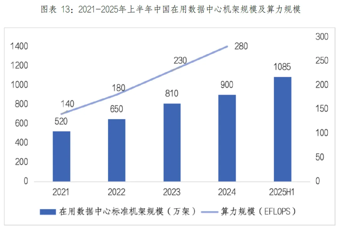 智算中心建设加快布局,总体规模进一步增长:近年来,我国持续加大对计算、存储和算力网络基础设施的投入,算力作为支撑人工智能发展的核心生产力,呈现出稳中有进的发展态势。据中国信通院《2025综合算力指数》数据显示,截至2025年6月底,我国在用算力中心机架总规模达1085万标准机架,智能算力规模达到788EFlops(FP16),为海量数据计算提供智能底座。与此同时,区域智能算力向统筹化和集约化部署布局。一方面,在全国一体化算力网建设、“东数西算”战略等大背景下,新建智能算力中心逐渐融入八大枢纽节点建设。截至2025年一季度,我国“东数西算”八大枢纽节点算力总规模达到215.5EFlops,智能算力规模占枢纽节点算力规模的80.8%,枢纽节点间20毫秒时延圈已基本实现。另一方面,重点城市区域智能算力供给能力持续提升。北京市2024年新增算力达8620PFlops,累计智能算力规模超过33EFlops;截止2025年7月,上海市智能算力规模已达到100EFlops;截至2025年3月,深圳已建和在建智能算力规模超过62EFlops。
