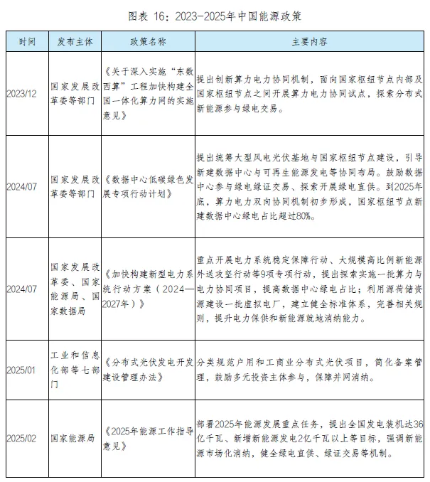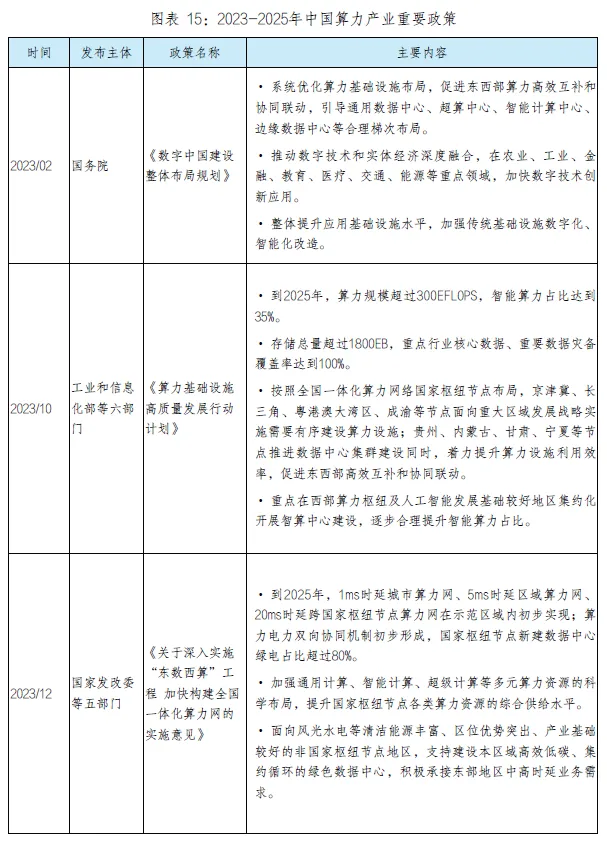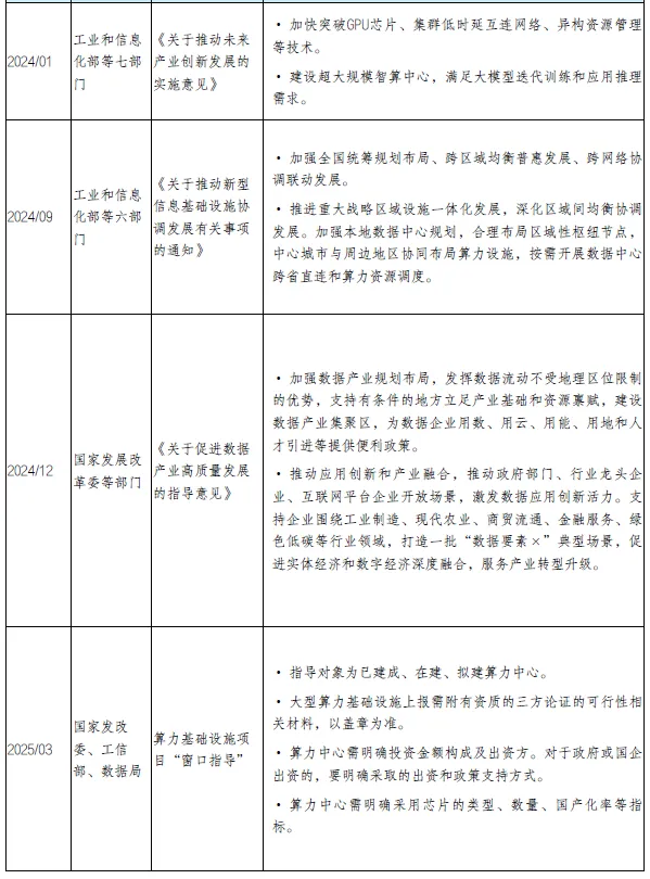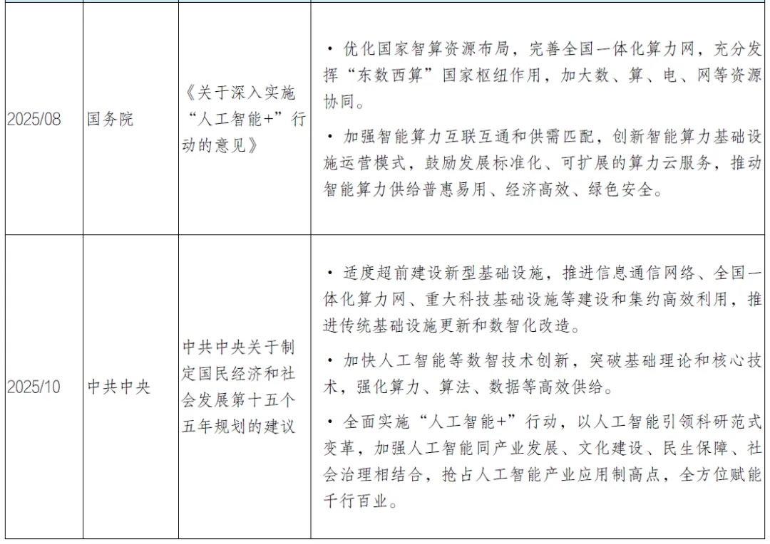 政策引导推动智算中心高质量发展:我国高度重视智算中心建设,自2020年发改委将智能计算中心纳入新基建范畴以来,国家相关部门相继出台了《新型数据中心发展三年行动计划 (2021-2023 年)》《算力基础设施高质量发展行动计划》等多份文件,提出统筹建设高性能智算中心,对于智算中心从鼓励建设转向深化布局,指引方向更加明确。2025年5月,国家数据局印发《数字中国建设2025年行动方案》,提出逐步实现各地区算力需求与国家枢纽节点算力资源高效供需匹配。2025年8月国务院印发《关于深入实施“人工智能 +”行动的意见》,明确提出强化智能算力统筹,加快超大规模智算集群技术突破和工程落地,优化国家智算资源布局,完善全国一体化算力网,加强智能算力互联互通和供需匹配,创新智能算力基础设施运营模式,推动智能算力供给普惠易用、经济高效、绿色安全。