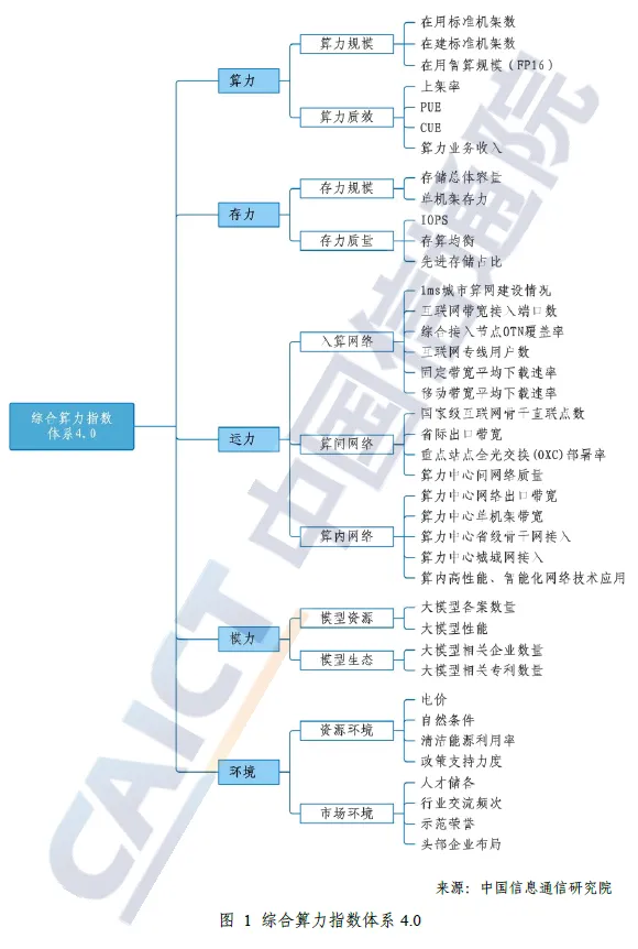 综合算力则是以算力为核心、存力为基础、运力为纽带、模力为赋能、环境为发展保障的多维度协同能力体系。其中,存力是算力中心在数据存储容量、性能表现、安全可靠和绿色低碳四方面的综合能力;运力是以数据通信网和光传送网等网络基础设施为基础,实现数据要素高效传输的网络运载力,包含算间网络、算内网络、入算网络;模力是大模型资源、生态建设水平的综合体现,反映对大模型训练与推理任务的支撑能力。