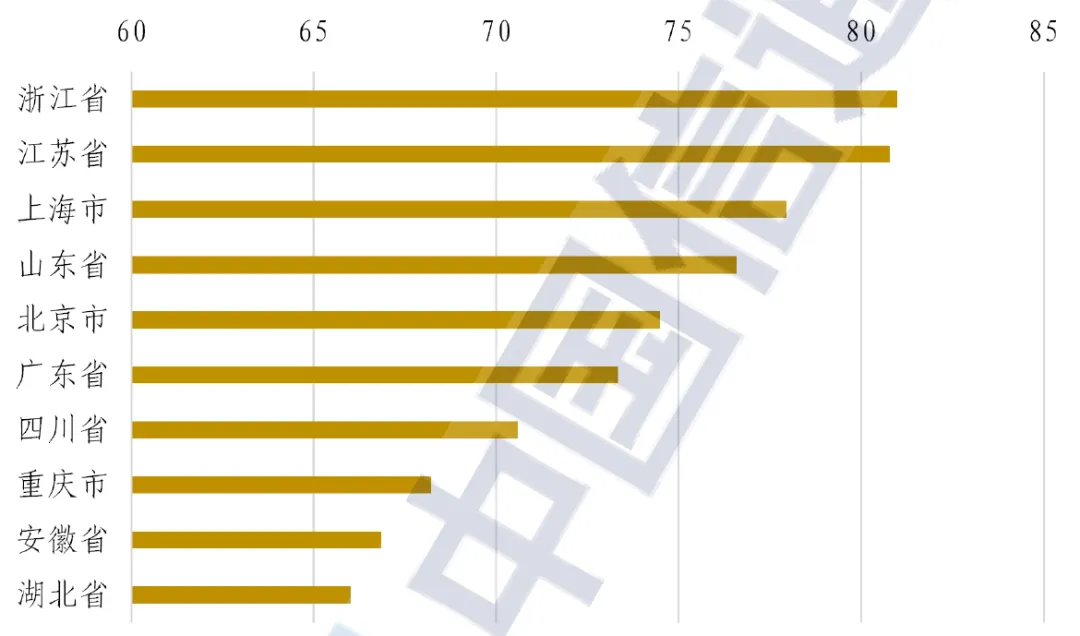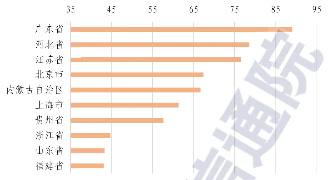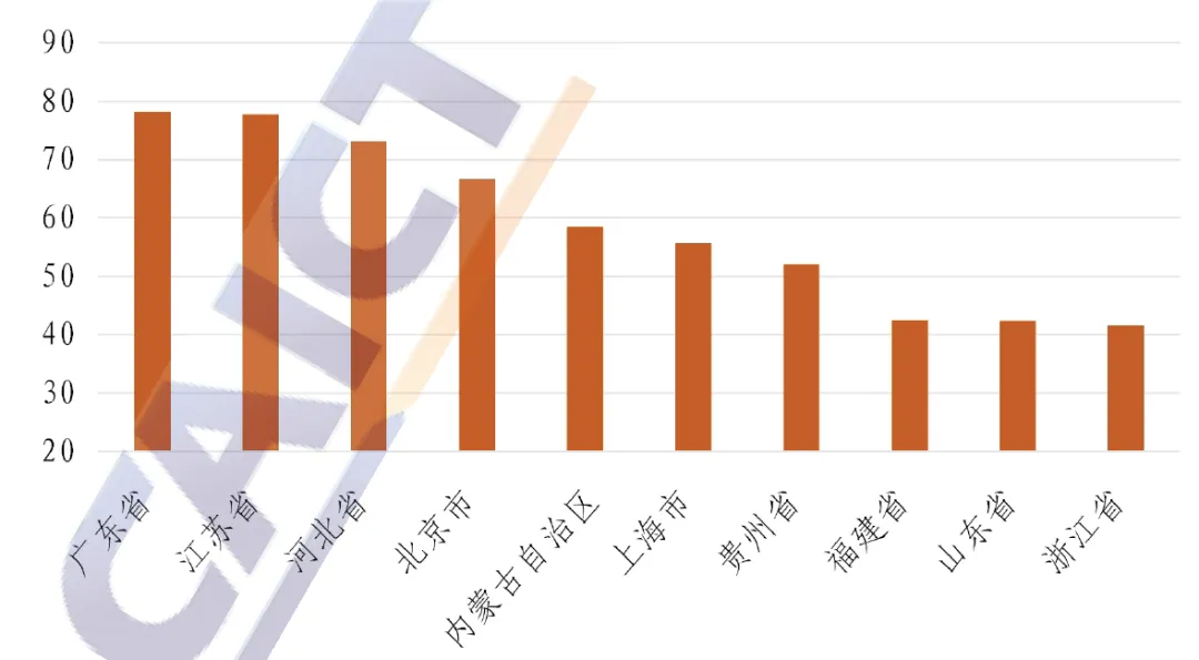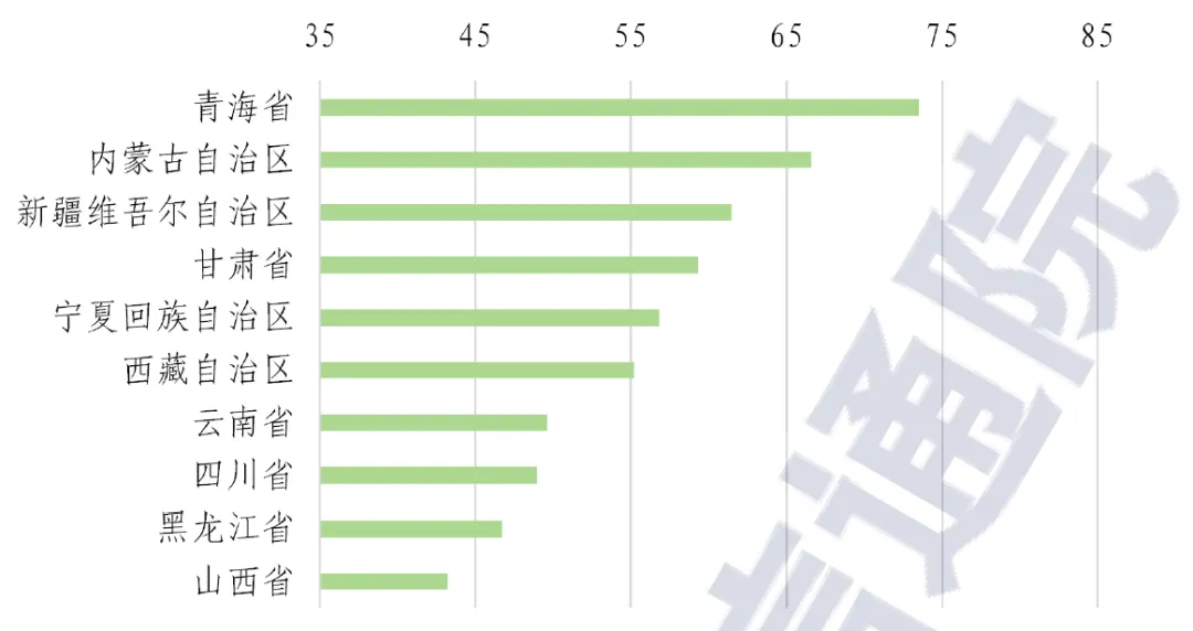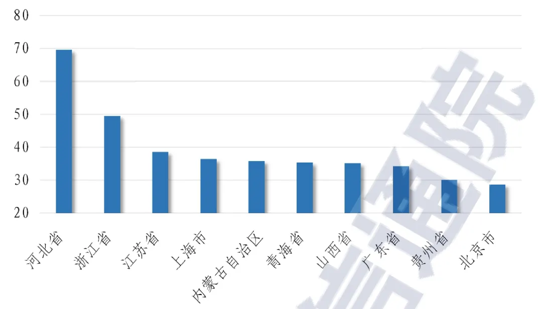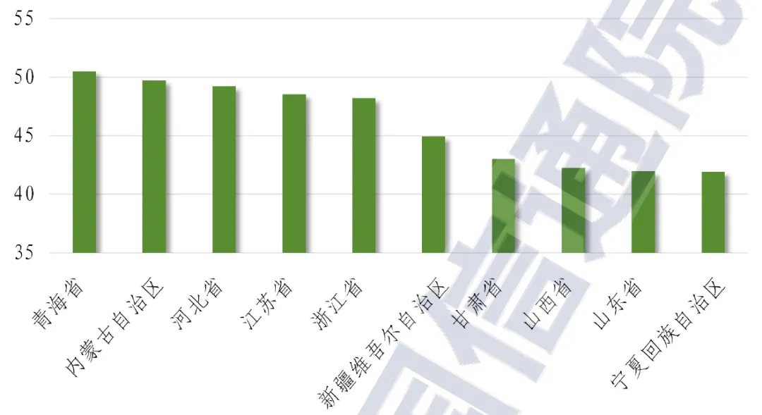 我国省级行政区环境分指数Top10为青海省、内蒙古自治区、河北省、江苏省、浙江省、新疆维吾尔自治区、甘肃省、山西省、山东省、宁夏回族自治区。环境分指数Top10中,东西部省份各占五成,在资源环境和市场环境方面呈现不同优势特征:西部地区在政策支持、气候条件与绿色能源供应等方面具备优势;东部沿海地区则在基础设施、人才集聚和产业生态建设方面表现突出。