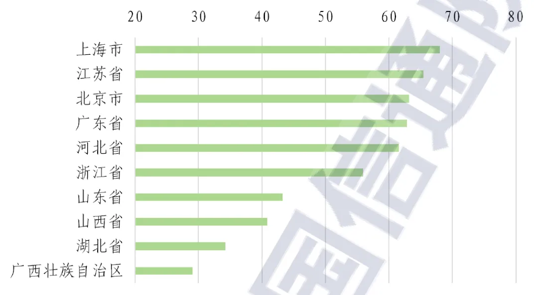 我国省级行政区环境分指数-市场环境Top10为上海市、江苏省、北京市、广东省、河北省、浙江省、山东省、山西省、湖北省、广西壮族自治区。东部地区在市场环境方面优势明显:一方面,这些地区集聚了众多算力产业头部企业、科研机构和用户群体,算力交易频繁,市场供需两旺;另一方面,算力基础设施建设和服务水平整体较高,政府和企业持续加大对算力中心、网络通信等基础设施的投入,完善的算力服务和多元化解决方案能够有效满足不同用户的差异化需求,进一步推动了算力市场的繁荣发展。