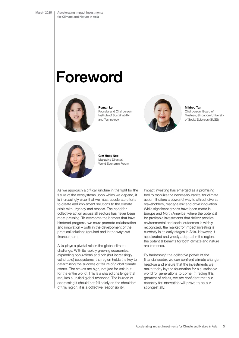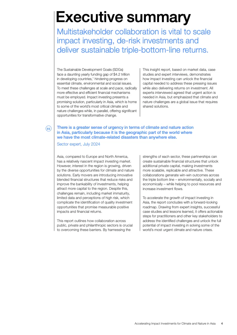 报告基于市场数据、案例研究和专家访谈,揭示了影响力投资如何撬动所需资金以应对紧迫议题,同时保障投资回报。受访专家一致认为亚洲需立即行动,但强调气候与生态挑战是需要全球共同解决方案的议题。