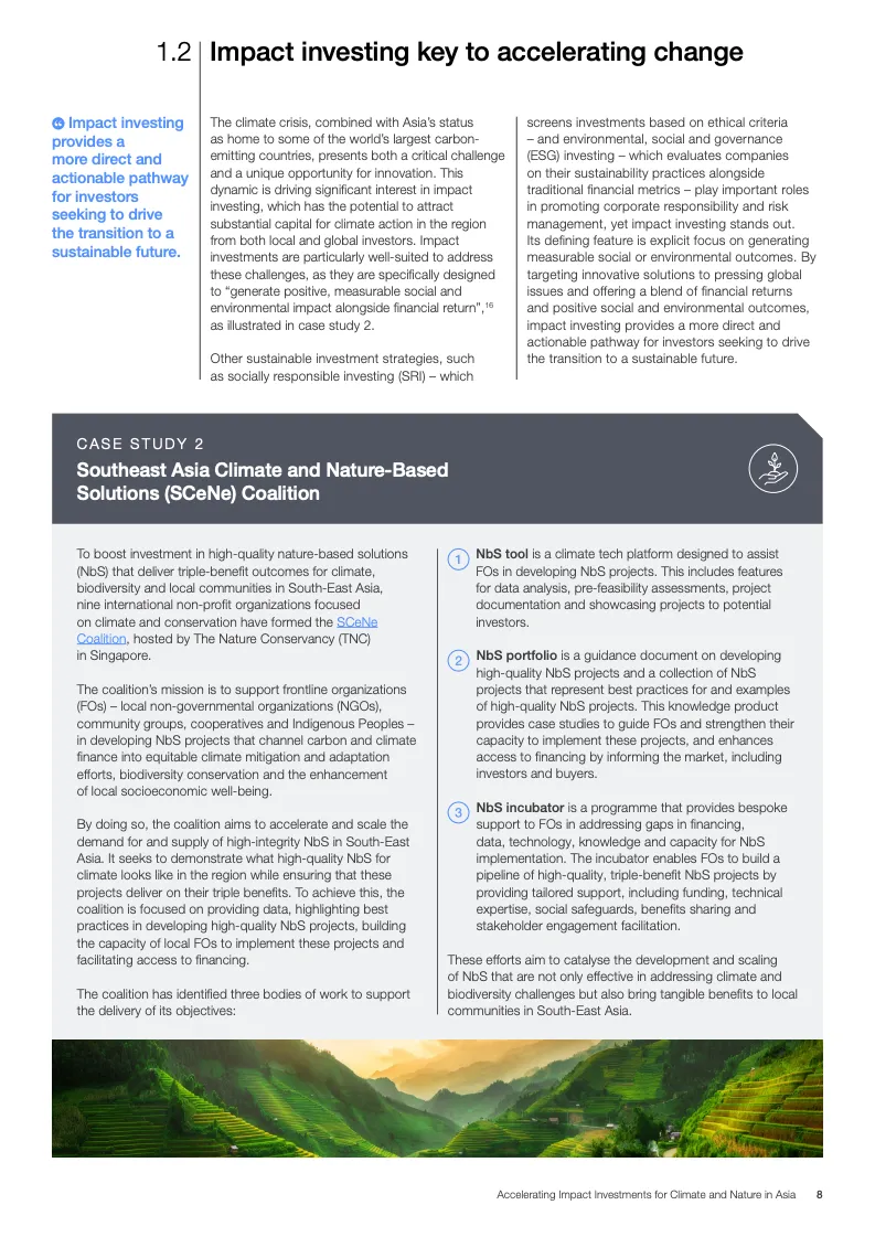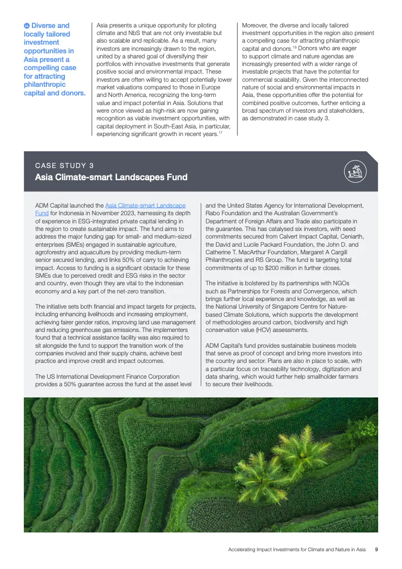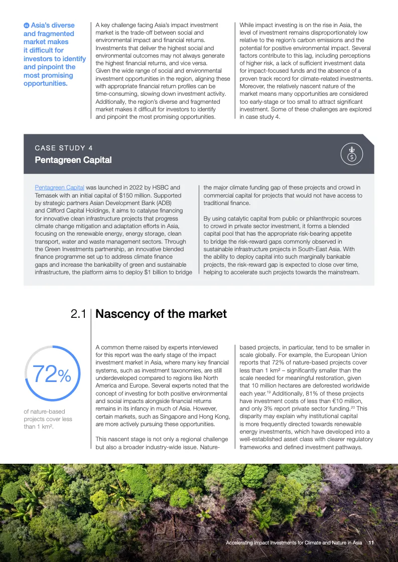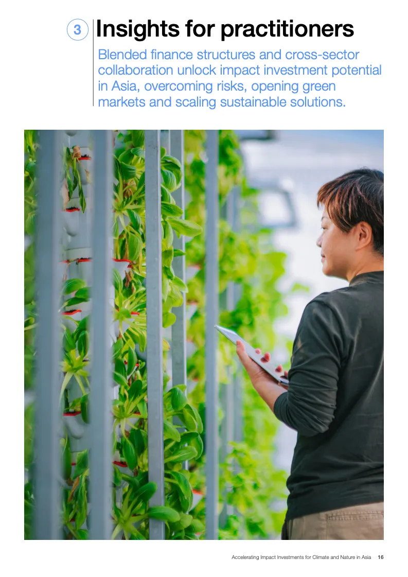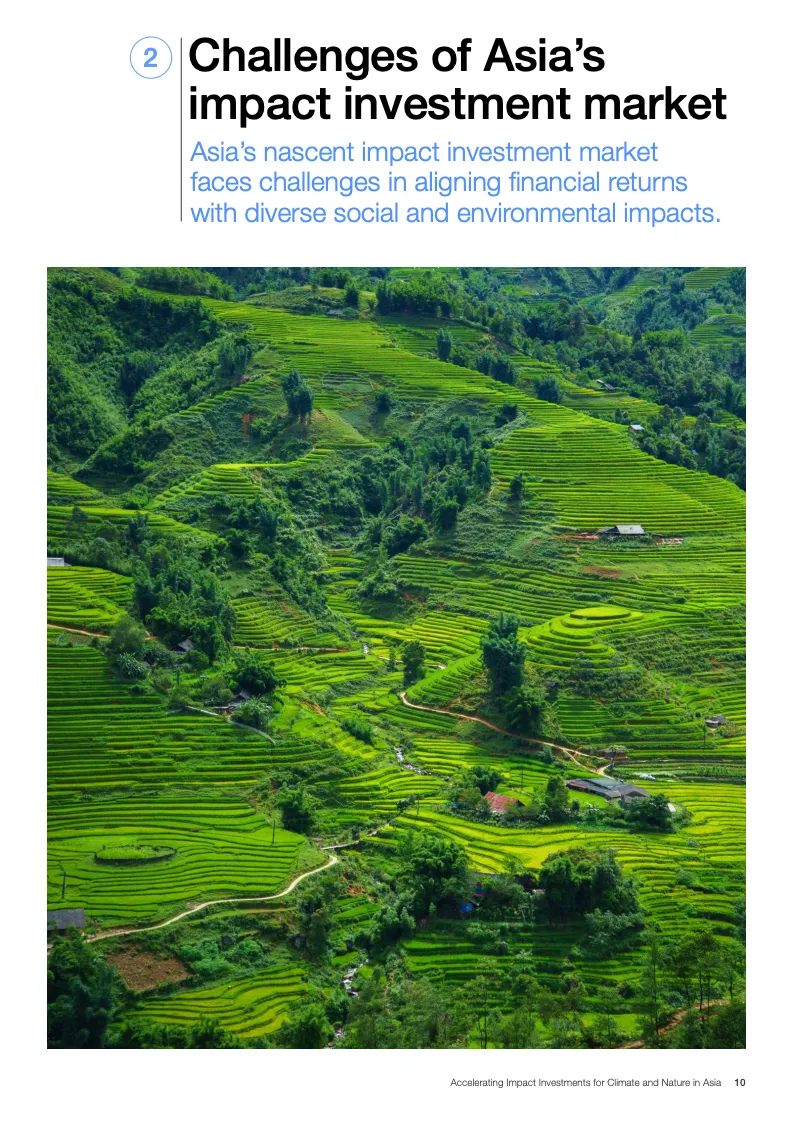 相较于欧美成熟市场,亚洲的影响力投资生态仍处于早期阶段。但得益于多元的气候与自然解决方案,该地区正吸引越来越多关注。先行者通过创新混合金融结构降低风险、提升项目可融资性,从而引导更多资本进入。市场不成熟、数据匮乏及高风险认知等挑战,仍阻碍着兼具可量化正向影响与财务回报的优质投资机会识别。