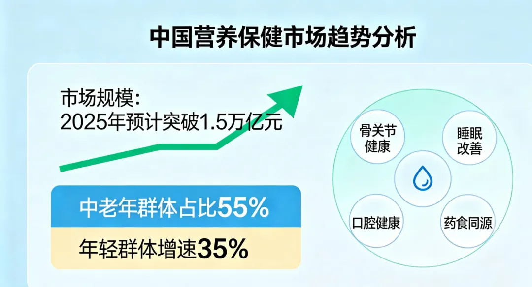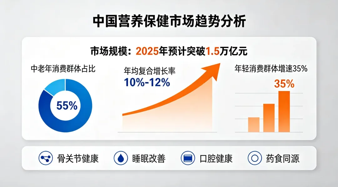 近年来,营养保健市场整体增长显著,银发群体已成为消费主力之一。截至2025年初,国内保健食品行业规模预计突破1.5万亿元,年均复合增长率维持在10%-12%之间。其中,功能性食品增长尤为迅速,预计2025年增速可达20%以上。